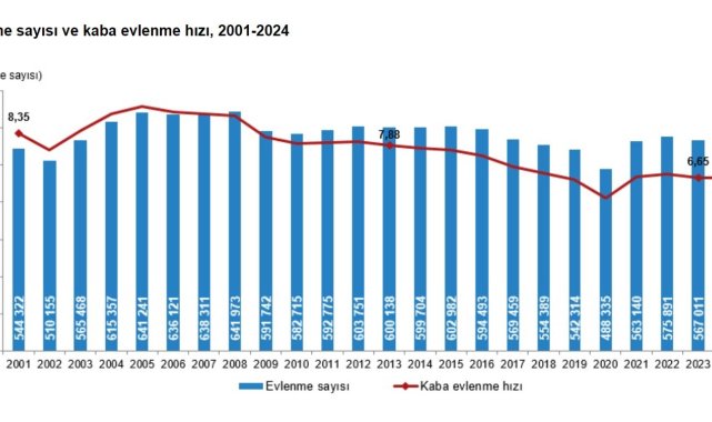 Türkiye İstatistik Kurumu (TÜİK), 2024 yılına ilişkin evlenme ve boşanma istatistiklerini açıkladı. Buna göre; evlenen çiftlerin sayısı 2023 yılında 567 bin 11 iken 2024 yılında 568 bin 395 oldu. Bin nüfus başına düşen evlenme sayısını ifade eden kaba evlenme hızı 2024 yılında binde 6,65 olarak gerçekleşti. Boşanan çiftlerin sayısı ise 2023 yılında 173 bin 342 iken; 2024 yılında 187 bin 343 oldu. Kaba boşanma hızı da 2024 yılında binde 2,19 olarak gerçekleşti.