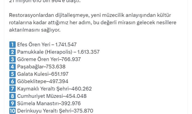 Bakan Ersoy'un paylaşımına göre; yılın ilk 8 ayında Efes Ören Yeri'ni 1 milyon 741 bin 547 kişi, Pamukkale'yi (Hierapolis) 1 milyon 613 bin 357 kişi, Göreme Ören Yeri'ni 766 bin 937 kişi, Paşabağlar Ören Yeri'ni 753 bin 638 kişi, Galata Kulesi'ni 651 bin 197 kişi, Göbeklitepe'yi 497 bin 394 kişi, Kaymaklı Yeraltı Şehri'ni 460 bin 262 kişi, Cumhuriyet Müzesi'ni 454 bin 48 kişi, Sümela Manastırı'nı 392 bin 976 kişi, Derinkuyu Yeraltı Şehri'ni ise 375 bin 870 kişi ziyaret etti.