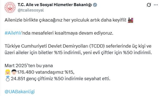 AİLE ve Sosyal Hizmetler Bakanlığı, 'Aile Yılı' kapsamında 176 bin 480 vatandaşın yüzde 15, 24 bin 851 genç çiftin de yüzde 50 indirimle tren yolculuğu yaptığını açıkladı. Bakanlığın sosyal medya hesabından yapılan açıklamada, "Ailenizle birlikte çıkacağınız her yolculuk artık daha keyifli. 'Aile Yılı'nda mesafeleri kısaltmaya devam ediyoruz. Türkiye Cumhuriyeti Devlet Demiryolları (TCDD) seferlerinde üç kişi ve üzeri aileler için biletler yüzde 15 indirimli, yeni evli çiftler için yüzde 50 indirimli. Mart 2025'ten bu yana 176 bin 480 vatandaşımız yüzde 15, 24 bin 851 genç çiftimiz yüzde 50 indirimle seyahat etti" denildi.
