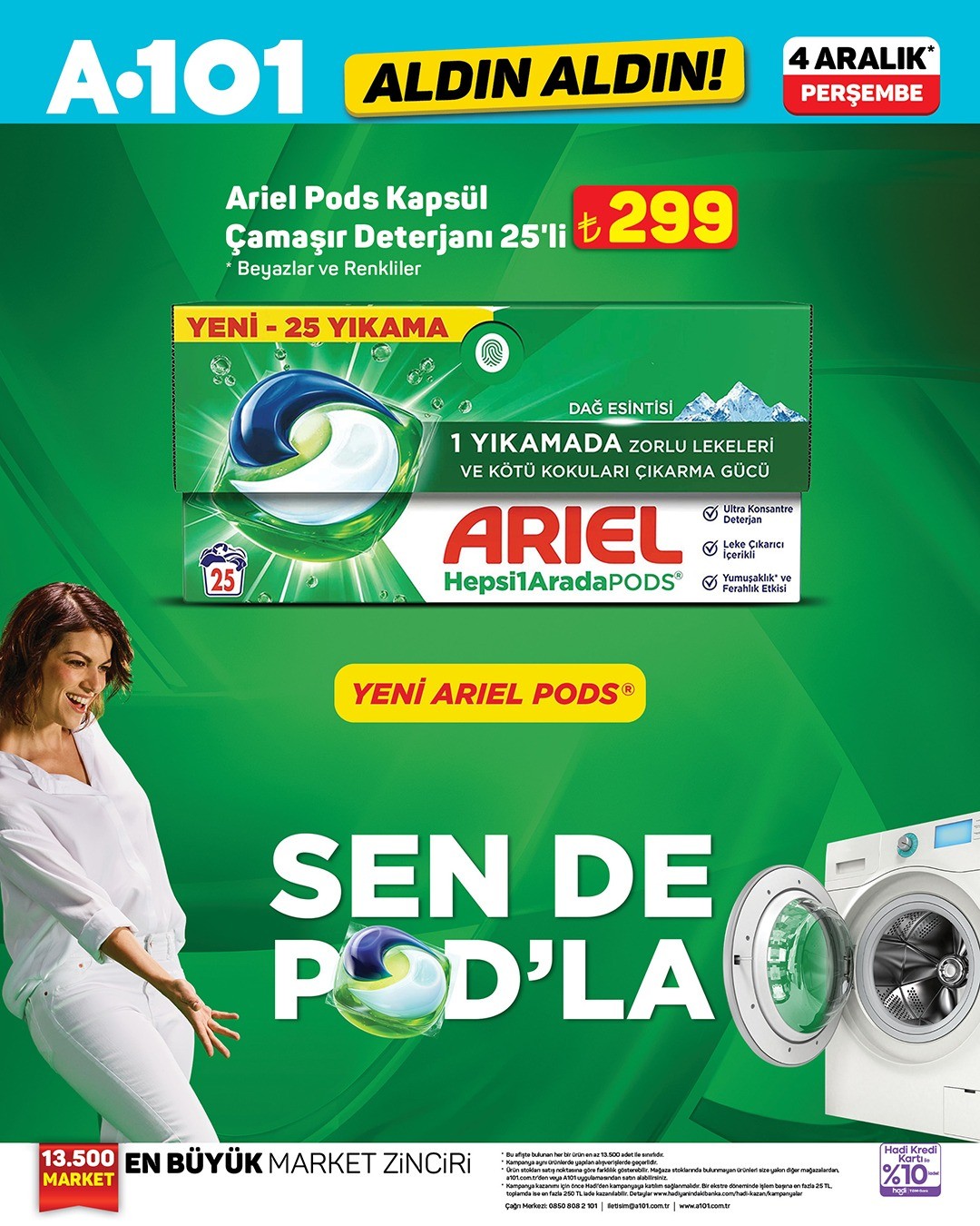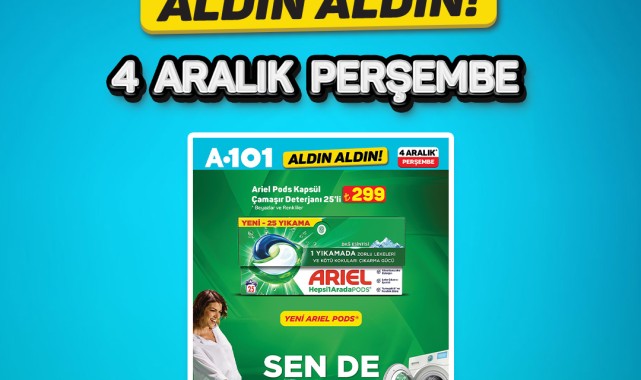 A101, 4 Aralık'tan itibaren geçerli olacak 'Aldın Aldın!' kampanyasıyla yeni ürünlerini görücüye çıkarıyor. Kampanya kapsamında Ariel Pods gibi dikkat çekici ürünler A101 mağazaları, A101 Kapıda ve A101 Ekstra'da satışa sunulacak. Stok durumu mağazalara göre farklılık gösterebilir.