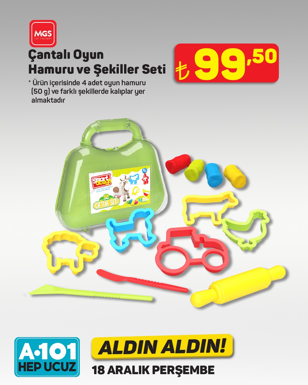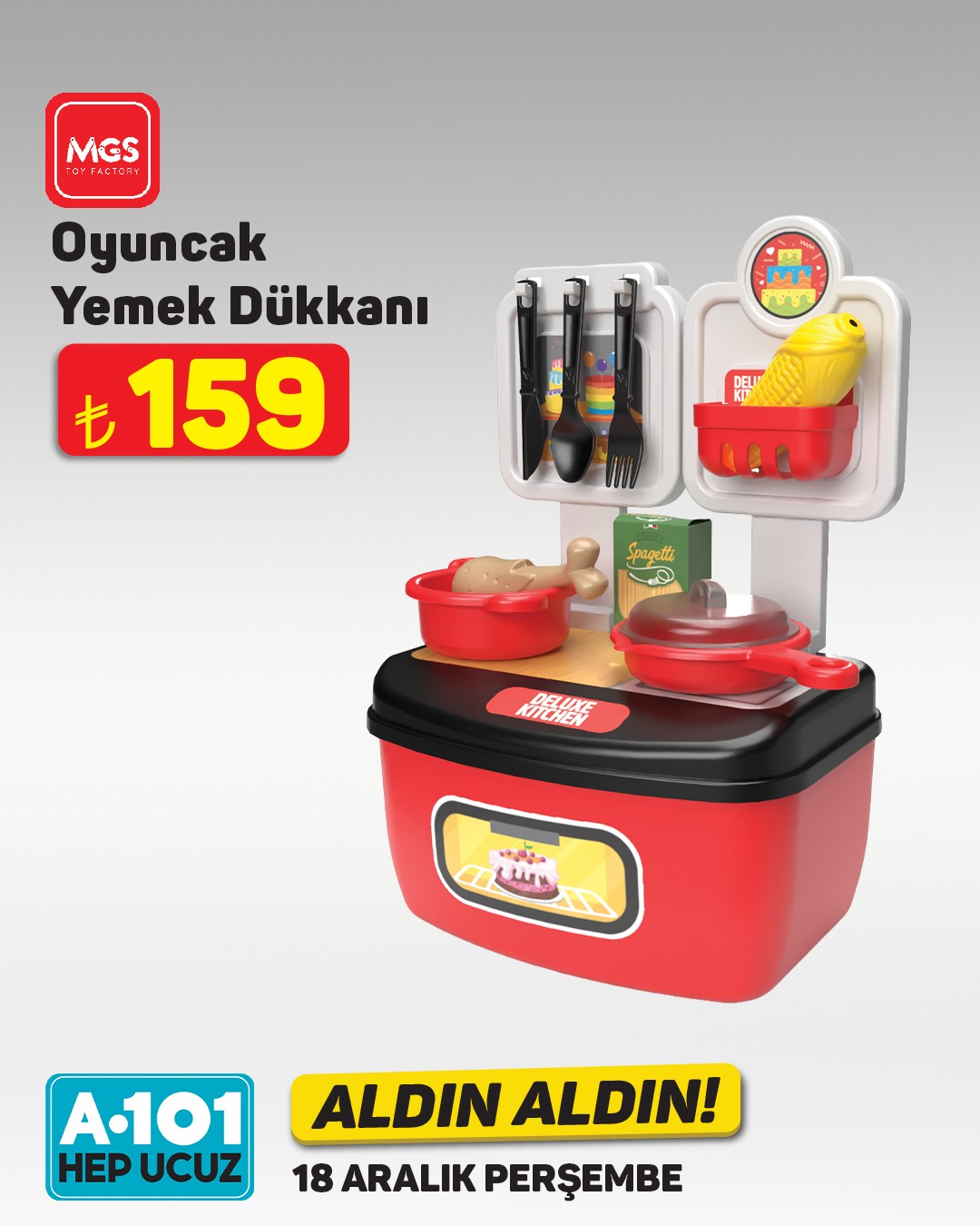 Market zinciri A101, gelenekselleşen Aldın Aldın kampanyasını 18 Aralık Perşembe günü başlatıyor.Kampanya kapsamında sunulacak ürünler, fiziksel mağazaların yanı sıra A101 Kapıda uygulaması ve A101 Ekstra platformu üzerinden de tüketicilerle buluşacak.İndirimli ürünler arasında yer alan oyuncaklardan bir tanesi, pilli gitar olarak dikkat çekiyor. Sesli ve ışıklı özelliğe sahip olan bu gitar, 2 adet 1.5V AA pil ile çalışıyor (piller ürüne dahil değildir) ve 269 TL fiyat etiketiyle raflardaki yerini alacak.A101 tarafından yapılan açıklamada, stokların satış noktasına göre farklılık gösterebileceği belirtildi. Müşteriler, mağaza stoklarında bulunmayan ürünleri en yakın diğer mağazalardan, A101 Ekstra veya A101 Kapıda uygulaması üzerinden temin edebilecekler.Editör: Haber MerkeziKaynak: Sosyal Medya