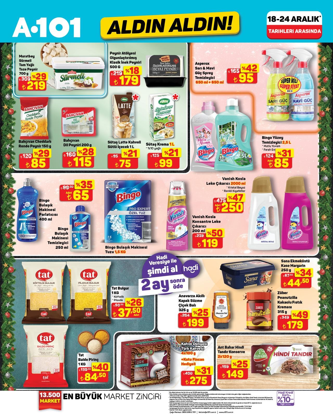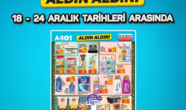 Türkiye genelindeki geniş market zinciri A101, her hafta merakla beklenen indirim kampanyalarını duyurdu. A101, 18-24 Aralık tarihleri arasında geçerli olacak yeni 'Aldın Aldın' fırsatlarını yayınladı.Kampanyalı ürünler, A101 mağazalarının yanı sıra A101 Kapıda uygulaması ve A101 Ekstra platformunda da satışa sunulacak. Müşterilerin, satın almak istedikleri ürünlerin stok durumlarını kontrol etmeleri öneriliyor. Stokların satış noktasına göre farklılık gösterebileceği belirtildi.Öne Çıkan Bazı Ürünler ve Fiyatları