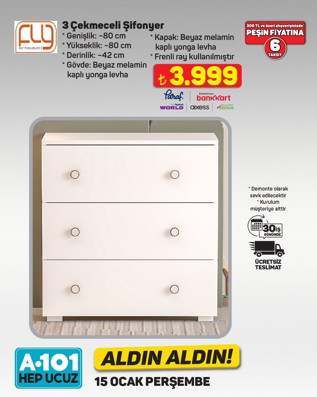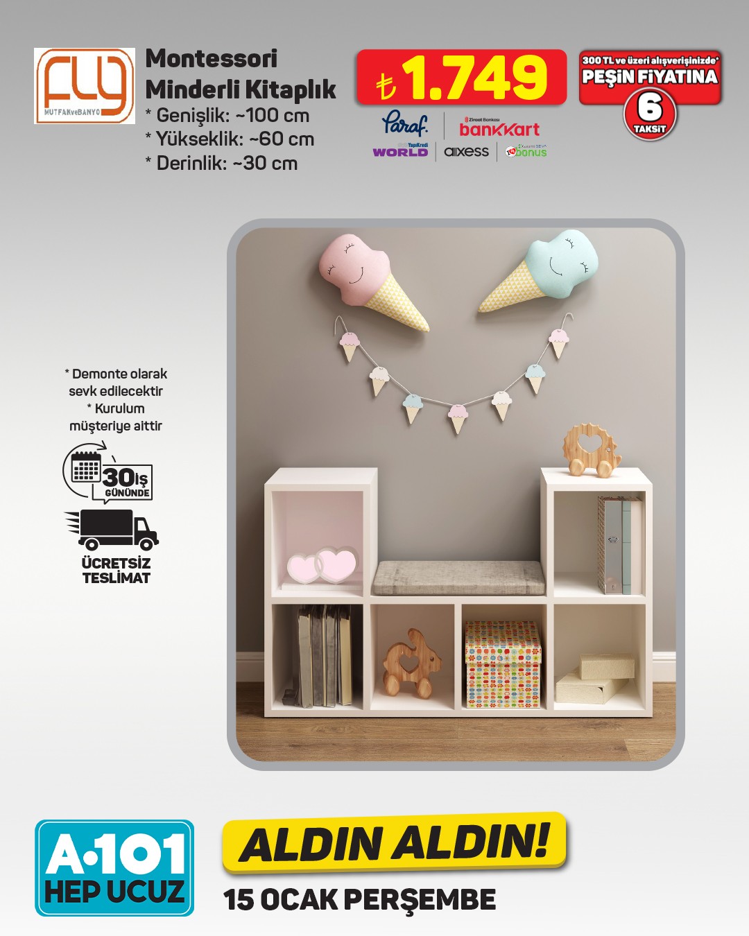 Kampanya dahilindeki Montessori Çok Amaçlı Kitaplık, yaklaşık 60 cm genişlik, 60 cm yükseklik ve 30 cm derinliğe sahip olacak. Ürün demonte olarak sevk edilecek olup, kurulum müşteriye aittir. Bu ürün, 30 iş gününde ücretsiz teslimat avantajıyla sunulacak ve fiyatı ₺999 olarak belirlendi.Ayrıca, Paraf, World ve Axess kartlara 6 taksit imkanı sağlanacak. A101, stokların satış noktasına göre farklılık gösterebileceğini belirterek, mağazalarda bulunmayan ürünlerin A101 Kapıda uygulaması üzerinden veya diğer mağazalardan temin edilebileceğini ekledi.Editör: Haber MerkeziKaynak: Sosyal Medya
