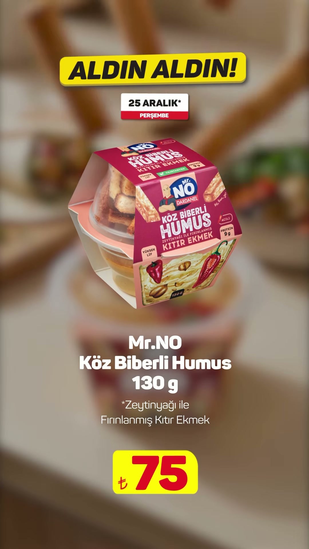 A101, 25 Aralık'ta başlayacak olan yeni Aldın Aldın kampanyası ürünlerini duyurdu. Mr. NO Köz Biberli Humus ve Kıtir Ekmek setinin 75 TL’den satışa sunulacağı belirtildi. Ürünlerin stok durumu mağazadan mağazaya farklılık gösterebilir.