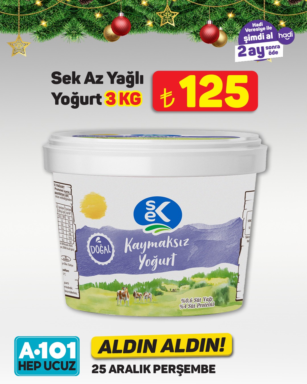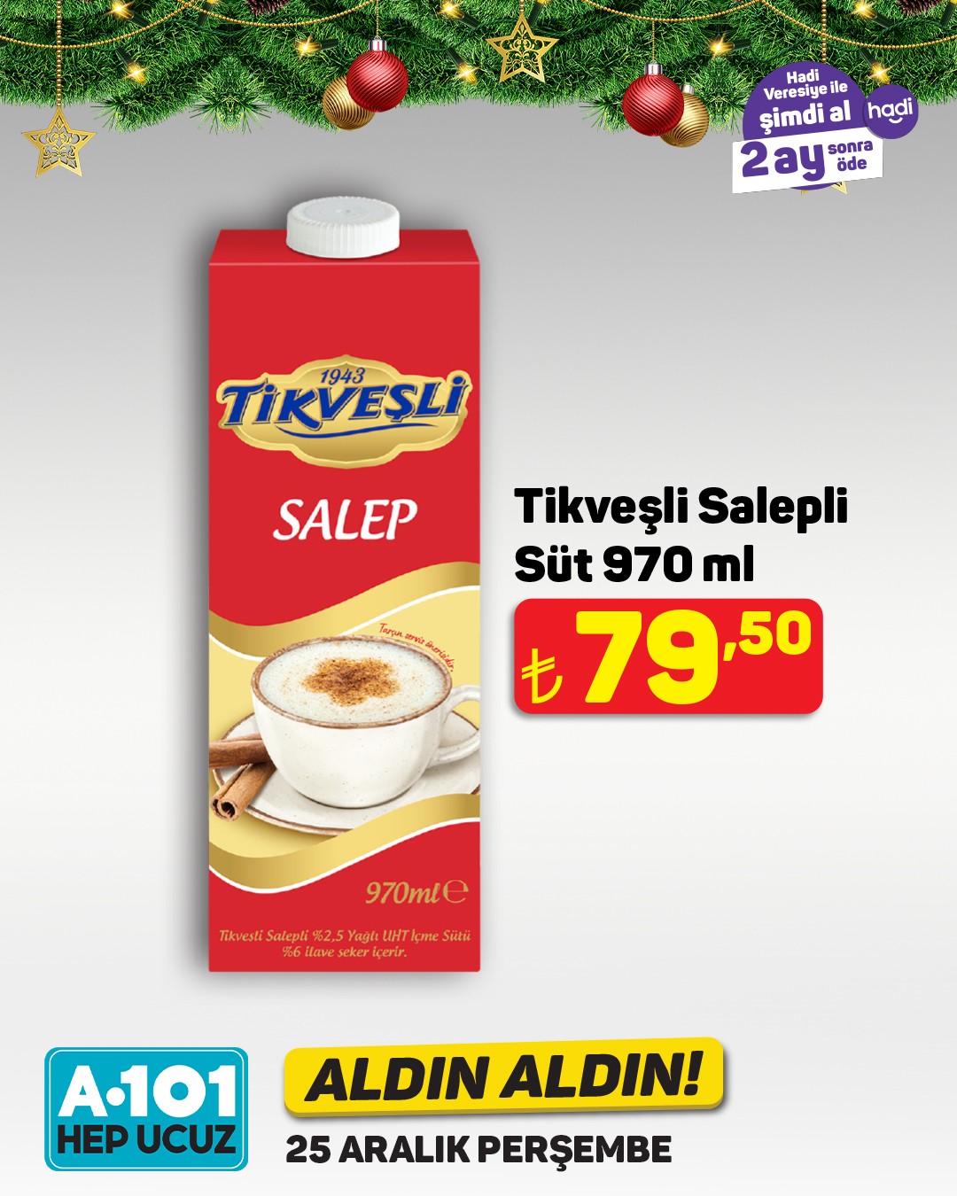 Perakende zinciri A101 , gelenekselleşen “Aldın Aldın” kampanyalı ürünlerinin 25 Aralık Perşembe gününden itibaren mağazalarında ve mobil uygulaması A101 Kapıda üzerinden satışa sunulacağını açıkladı.Yapılan açıklamada, tüketicilerin Altınkılıç Ezine Çiftliği Yarım Yağlı Tost Peyniri 1 KG gibi fırsat ürünlerine 25 Aralık tarihi itibarıyla ulaşabileceği belirtildi. Ürünün fiyatı 289 TL olarak duyuruldu.A101 tarafından yapılan paylaşımda, ürün stoklarının satış noktasına göre değişiklik gösterebileceği vurgulandı. Tüketicilere, mağaza stoklarında bulunmayan ürünler için A101 Kapıda uygulamasını kullanma veya kendilerine yakın diğer mağazaları kontrol etme önerisi yapıldı.Editör: Haber MerkeziKaynak: Sosyal Medya