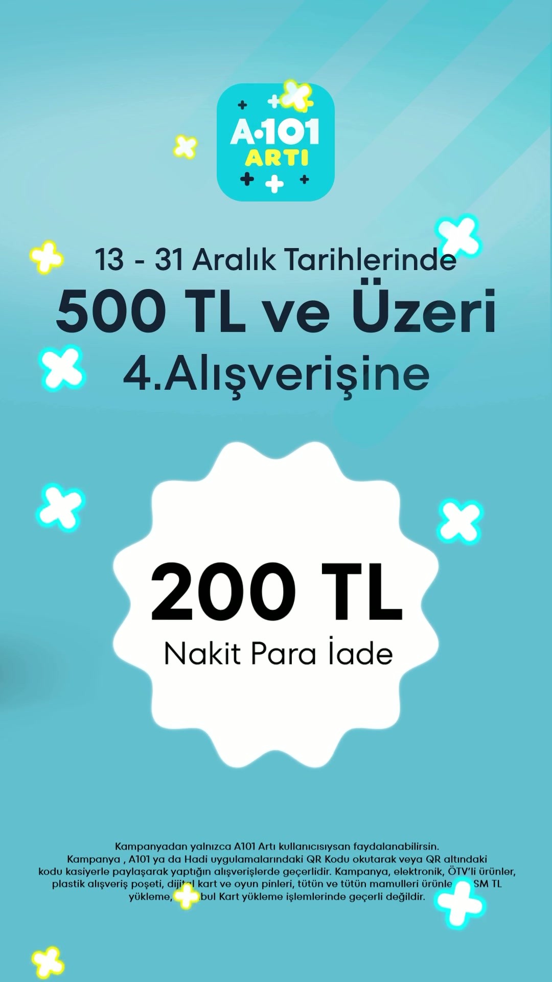 A101 Artı uygulaması kullanıcılarına yönelik yeni bir kampanya başladı. 13-31 Aralık tarihleri arasında geçerli olan kampanya kapsamında, 500 TL ve üzeri yapılan dördüncü alışverişe 200 TL nakit para iadesi sunuluyor.