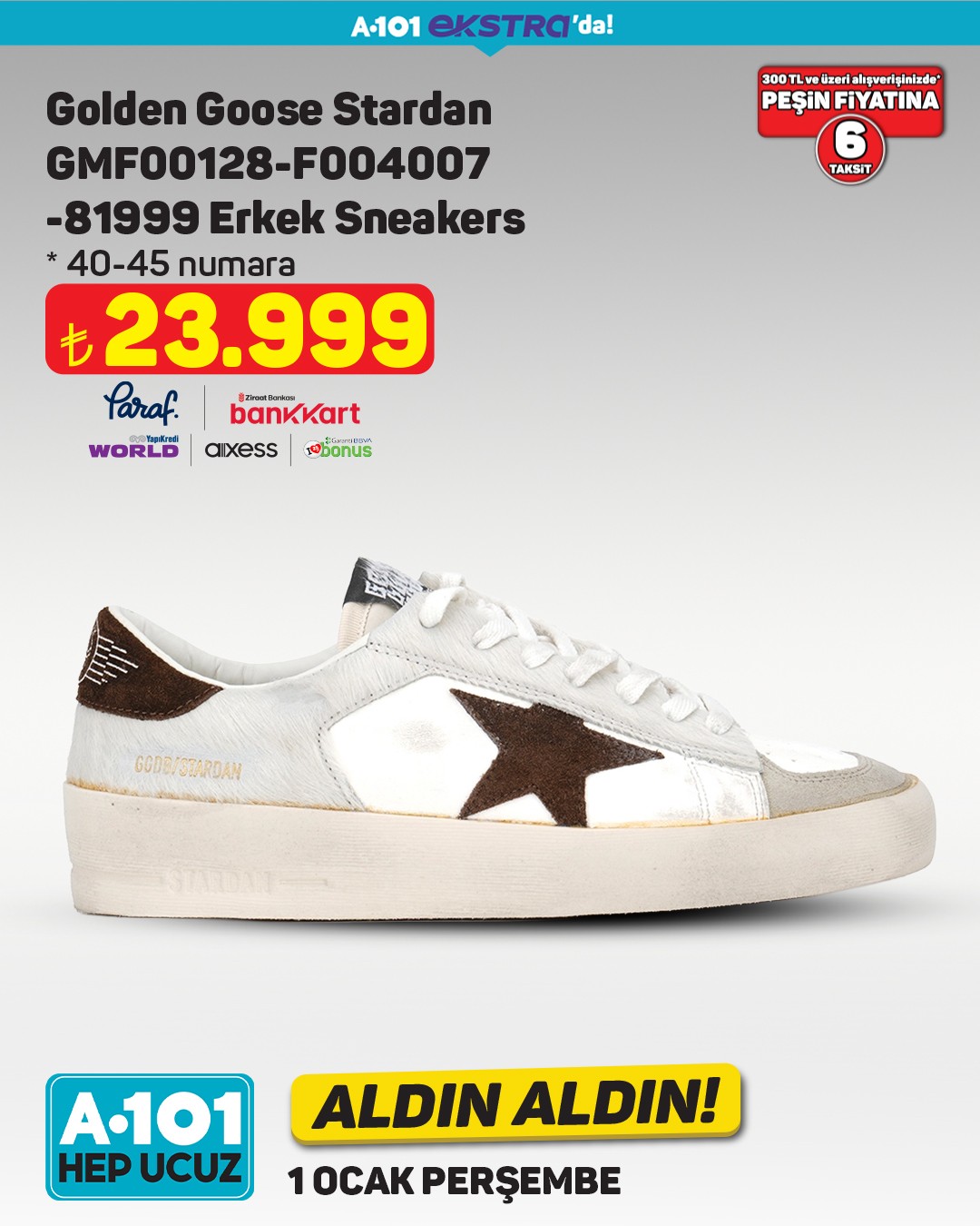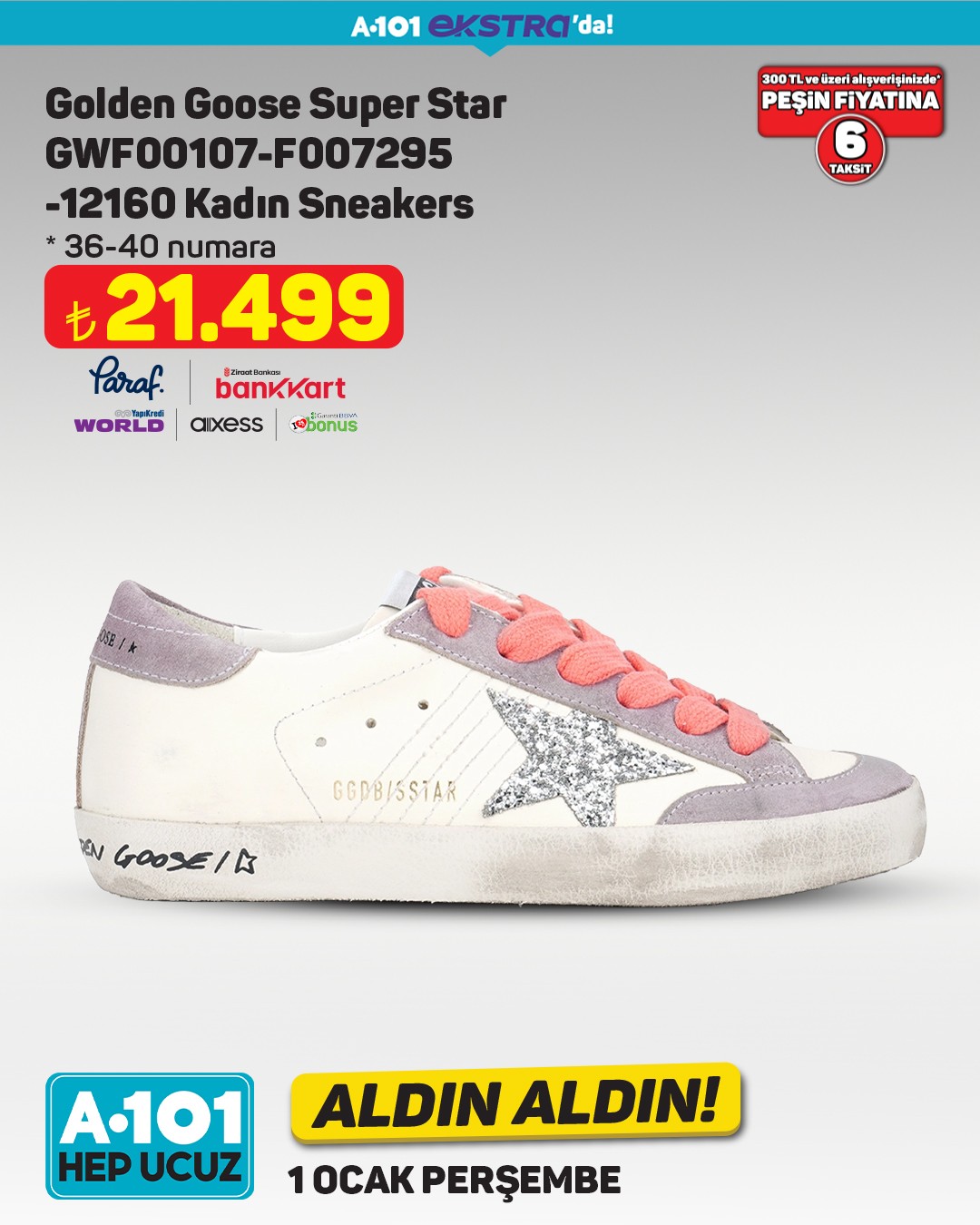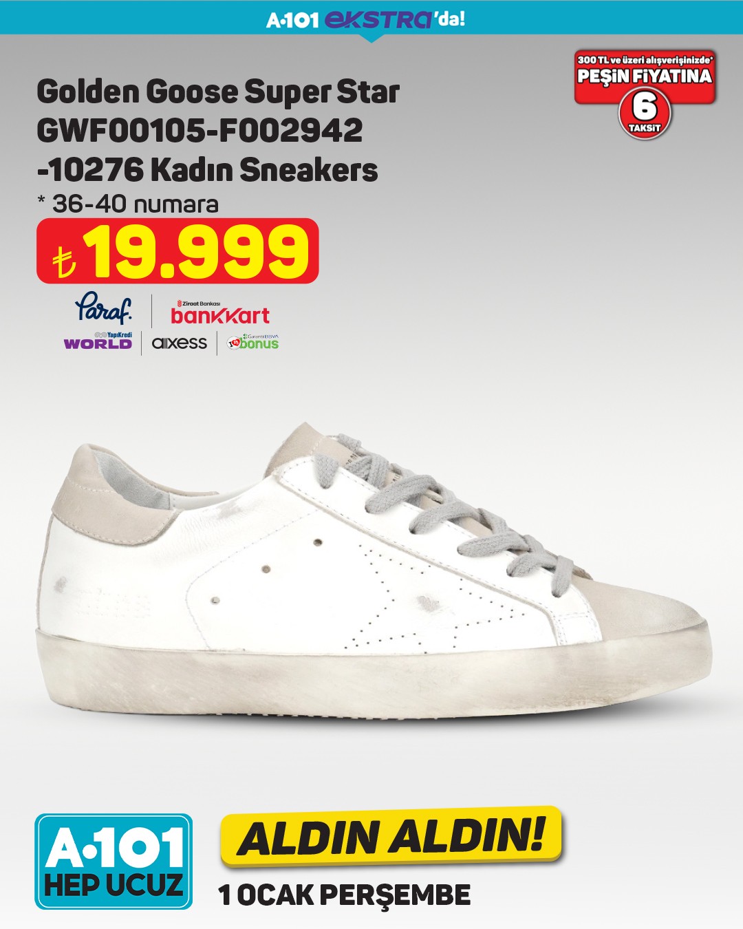 A101, 1 Ocak'tan itibaren A101 Ekstra’da geçerli olacak yeni Aldın Aldın fırsatlarını duyurdu. Kampanya kapsamında Golden Goose marka kadın sneaker modeli dikkat çeken fiyatıyla satışa sunulacak.