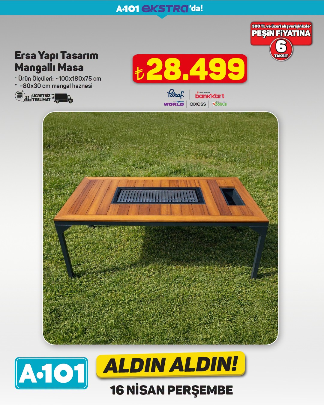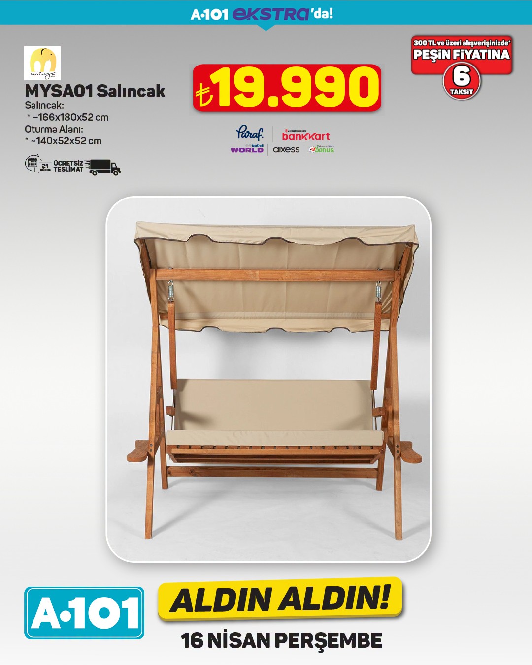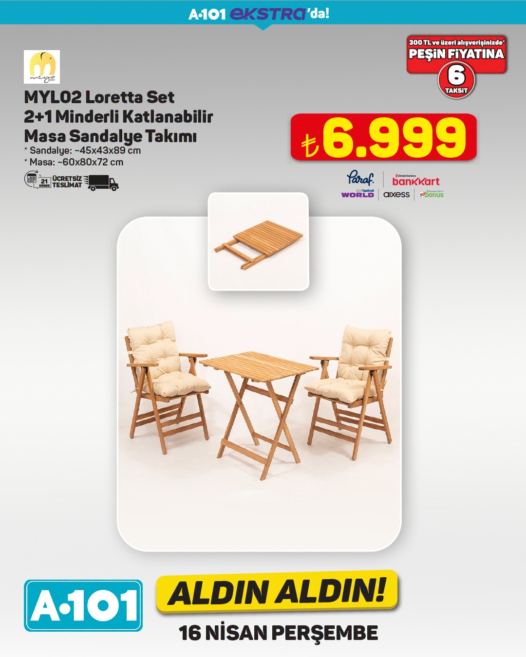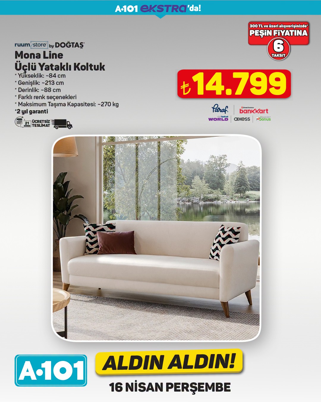 A101, 16 Nisan tarihinden itibaren geçerli olacak 'Aldın Aldın' kampanyası kapsamında ekstra ürünlerini müşterilerine sunuyor. Kampanyada, çift kişilik yatak ve masa takımı gibi ev ürünleri dikkat çekiyor.Özellikle 'Hybrid 5 Zone Pocket Yaylı Çift Kişilik Yatak', 160x200 cm ölçüleriyle öne çıkıyor. Ürün, 13.499 TL fiyat etiketiyle satışa sunulacak. Kampanya kapsamında belirtilen ürünlerde 300 TL ve üzeri alışverişlerde ücretsiz teslimat imkanı da bulunuyor.