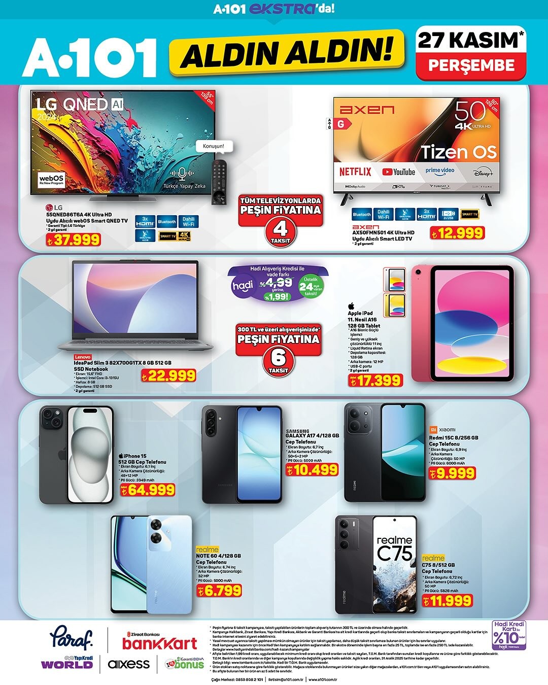 A101, 27 Kasım Perşembe gününden itibaren A101 Ekstra platformunda yeni 'Aldın Aldın' fırsatlarını duyurdu. Kampanyada televizyonlardan cep telefonlarına, ev aletlerinden beyaz eşyalara kadar çeşitli ürünler yer alacak.