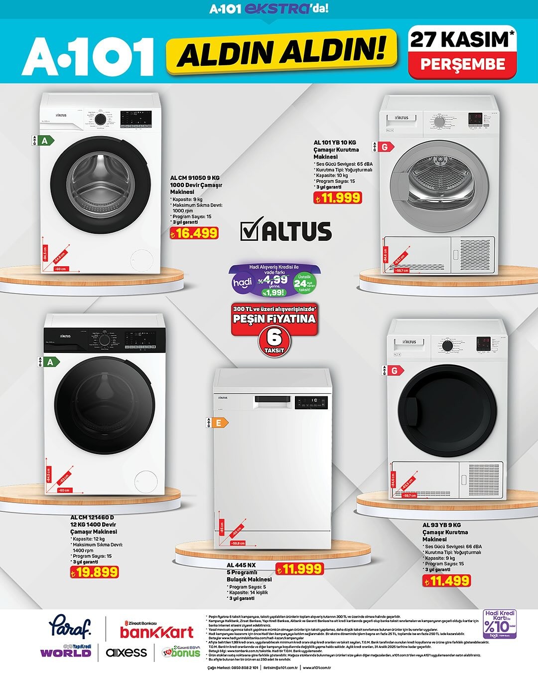 Ayrıca, Realme C75 Cep Telefonu ve ALTUS markalı buzdolabı gibi ürünler de 27 Kasım Perşembe gününden itibaren A101 mağazalarında ve online platformda satışta olacak. Kampanyaya özel kredi kartı taksitlendirmeleri ve yüzde 10'a varan indirim fırsatları da sunuluyor.