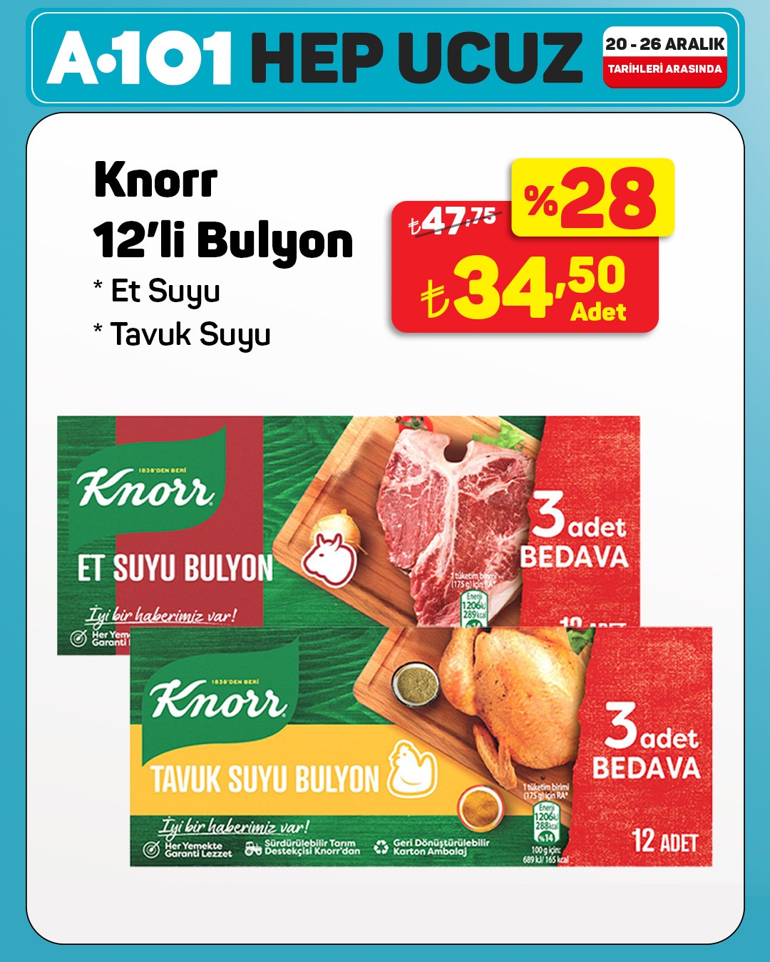 Perakende zinciri A101 , 20 Aralık ile 26 Aralık tarihleri arasında geçerli olacak indirimli ürünlerini duyurdu. Müşteriler, bu hafta özellikle Knorr markasına ait çeşitli çabuk çorba çeşitlerinde uygun fiyat fırsatlarından yararlanabilecek.Knorr Çabuk Çorbalar Cazip Fiyatlarla Raflarda