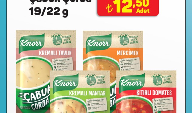 Kampanya dahilinde yer alan Knorr Çabuk Çorbalar, tüketicilere hızlı ve pratik bir alternatif sunuyor. İndirimli ürünler arasında Knorr Kremalı Tavuk, Knorr Mercimek, Knorr Kremalı Mantar ve Knorr Kıtırlı Domates çorbaları bulunuyor.Örneğin, Knorr Kremalı Tavuk Çabuk Çorba 19/22 gramlık paketleri 16,50 TL yerine 12,50 TL adet fiyatıyla raflarda yer alacak. Ürünlerin kısa sürede hazırlanabilir olması, yoğun günler için avantaj sağlıyor.Stok Durumu ve Satın Alma Kanalları