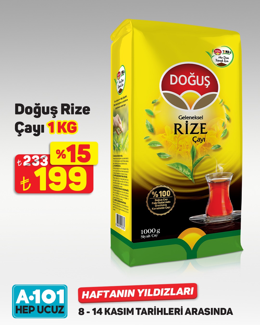 A101 marketleri, 8 Kasım ile 14 Kasım tarihleri arasında geçerli olacak 'Haftanın Yıldızları' kampanyasını duyurdu. Kampanya kapsamında birçok üründe indirimler müşterilere sunulacak. A101 Kapıda uygulaması ve A101 Ekstra platformunda da bu indirimlerden yararlanılabileceği belirtildi.