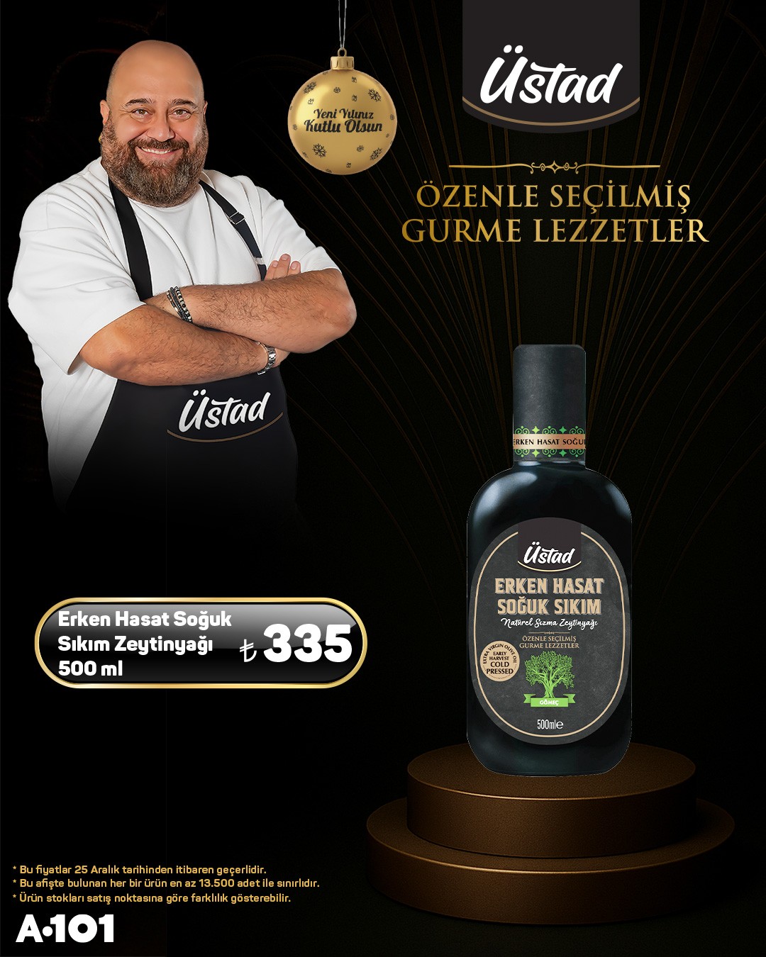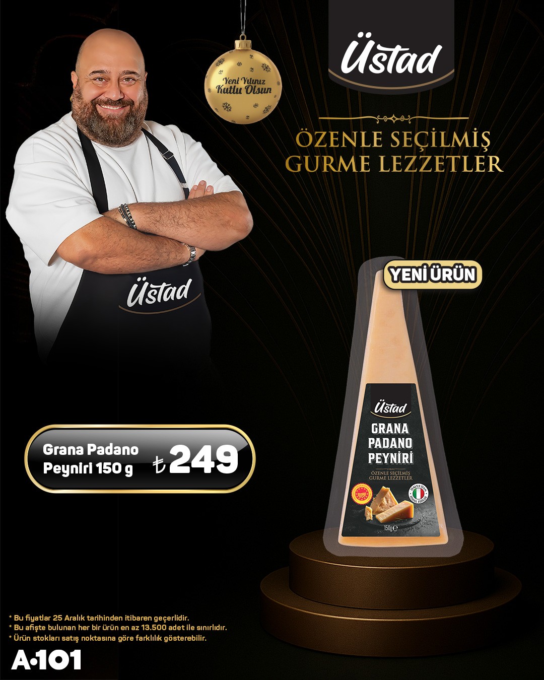 Perakende zinciri A101, müşterilerinin beğenisine sunduğu ürün gamını genişleterek Üstād markasına ait gurme lezzetleri satışa sundu.A101 tarafından yapılan açıklamaya göre, özellikle Üstād Göbek Kaşar Peyniri, müşterilerin ilgisini çekecek bir fiyatla reyonlardaki yerini aldı.Üstād Göbek Kaşar Peyniri'nin 400 gramlık paketinin 179 TL'den satışa sunulduğu belirtildi. Ürünün etiketinde yer alan bilgilere göre, bu peynir çeşidi tam yağlı olup, 1 kg ürün ortalama 12 kg sütten üretilmektedir ve mayalama sürecinde şirden mayası kullanılmıştır.A101, bu özel fiyatların 25 Aralık tarihinden itibaren geçerli olduğunu duyurdu. Ayrıca, afişte yer alan her bir ürünün satış noktalarında en az 13.500 adet ile sınırlı olduğu ve stokların satış noktasına göre farklılık gösterebileceği bilgisi paylaşıldı.Editör: Haber MerkeziKaynak: Sosyal Medya