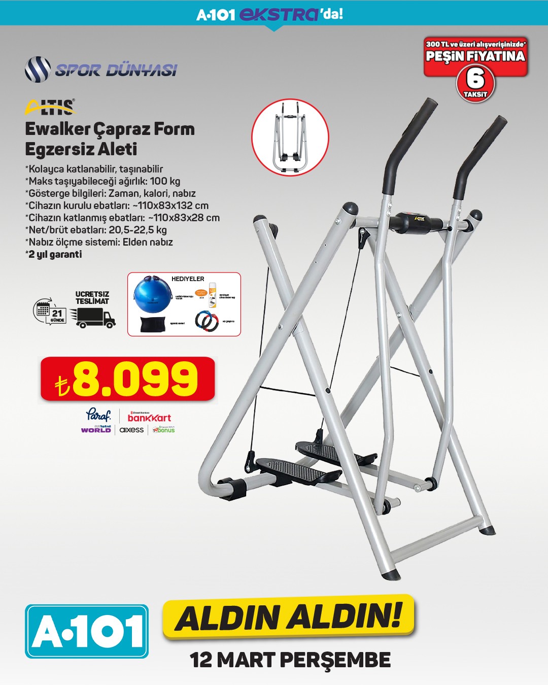 A101, 12 Mart Perşembe gününden itibaren geçerli olacak "Aldın Aldın" kampanyası kapsamında spor ekipmanlarını satışa sunuyor. Kampanyada, 300 TL ve üzeri alışverişlerde peşin fiyatına 6 taksit imkanı da bulunuyor.