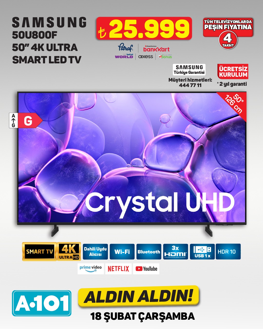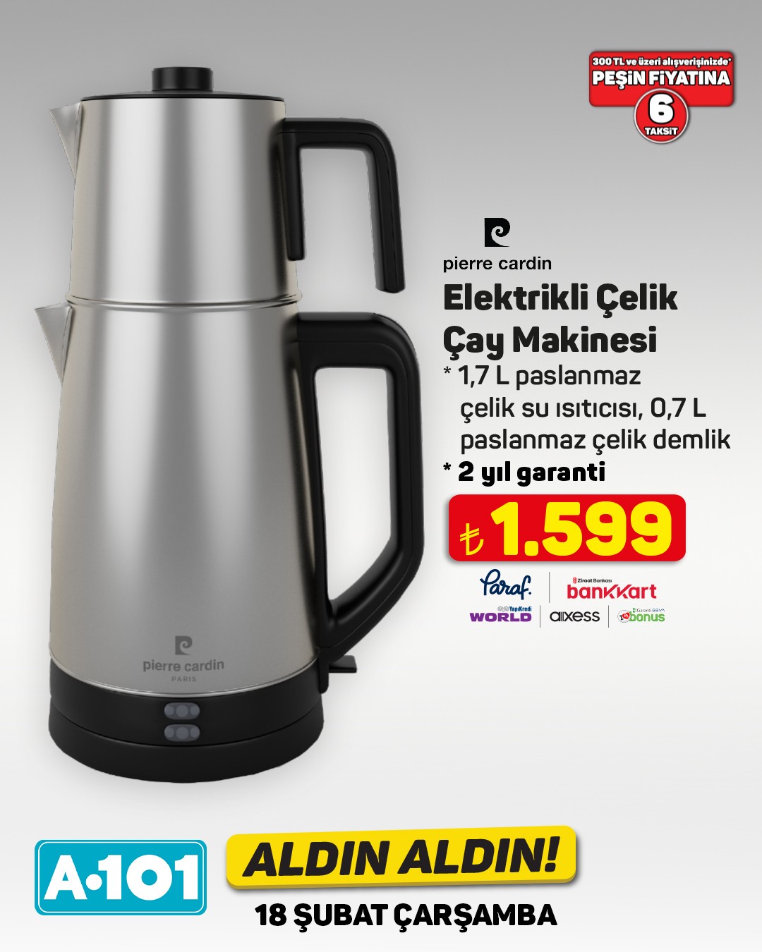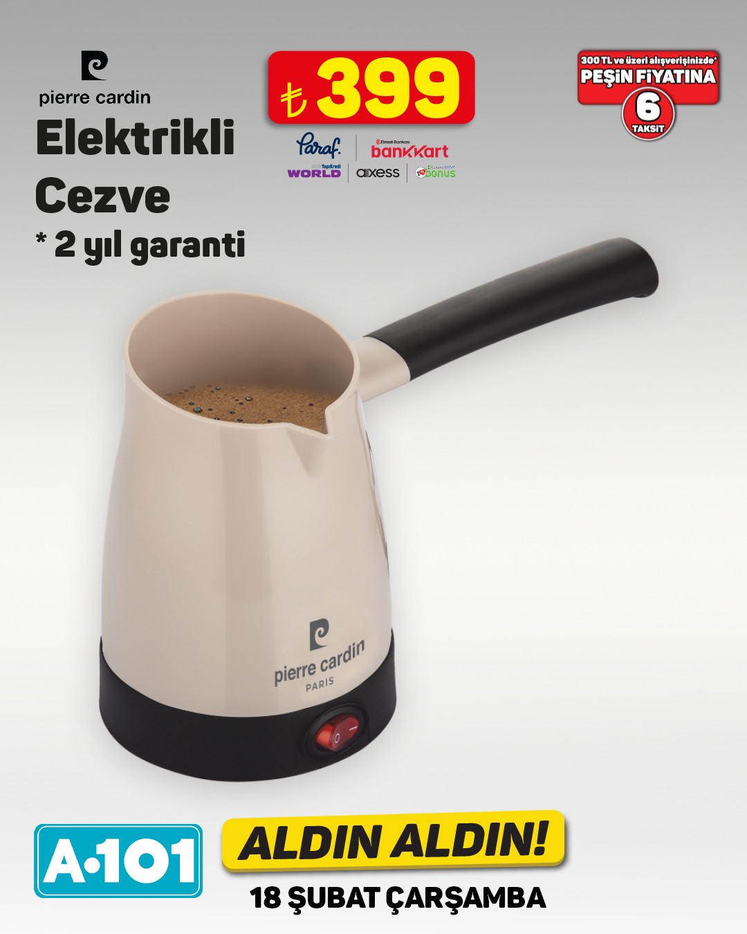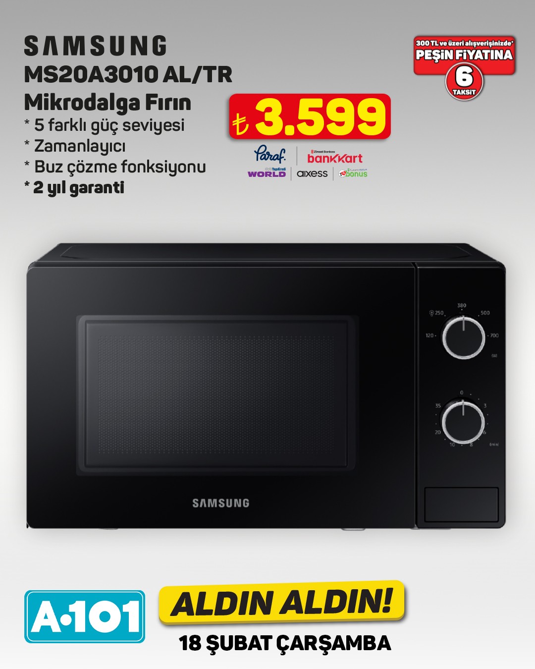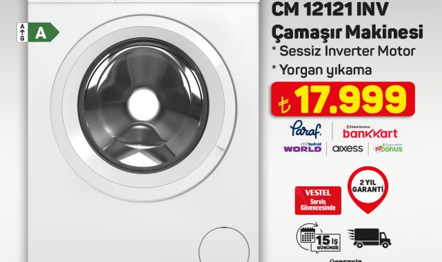 A101 marketleri, 18 Şubat tarihinden itibaren geçerli olacak 'Aldın Aldın' kampanyasıyla yeni ürünleri müşterilerine sunuyor. Kampanya kapsamında çamaşır makineleri, televizyonlar ve cezveler gibi çeşitli ürünler A101 mağazalarında ve A101 Ekstra platformunda yer alacak.Kampanyada öne çıkan ürünlerden biri olan SEG marka CM 12121 INV çamaşır makinesi, 12 kilogram yıkama kapasitesi ve 1200 devir hızıyla dikkat çekiyor. Sessiz Inverter Motoru, yorgan yıkama programı ve Vestel servis güvencesiyle 2 yıl garanti sunan ürün, 17.999 TL fiyatla satışa sunulacak. Ayrıca, 300 TL ve üzeri alışverişlerde peşin fiyatına 6 taksit imkanı da bulunuyor.