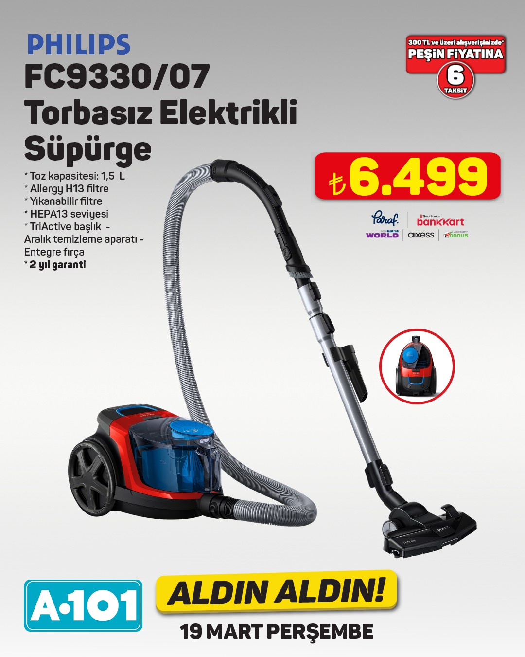 A101'in 19 Mart'ta başlayacak olan 'Aldın Aldın' kampanyası, çeşitli ürün gruplarında indirimli fiyatlar sunmayı hedefliyor. Bu kampanya kapsamında yer alan Philips buharlı ütü, 3.299 TL fiyat etiketiyle satışa sunulacak. Ayrıca, Paraf, Bankkart, World, Axess ve Bonus kredi kartlarına peşin fiyatına 6 taksit imkanı da sunuluyor.