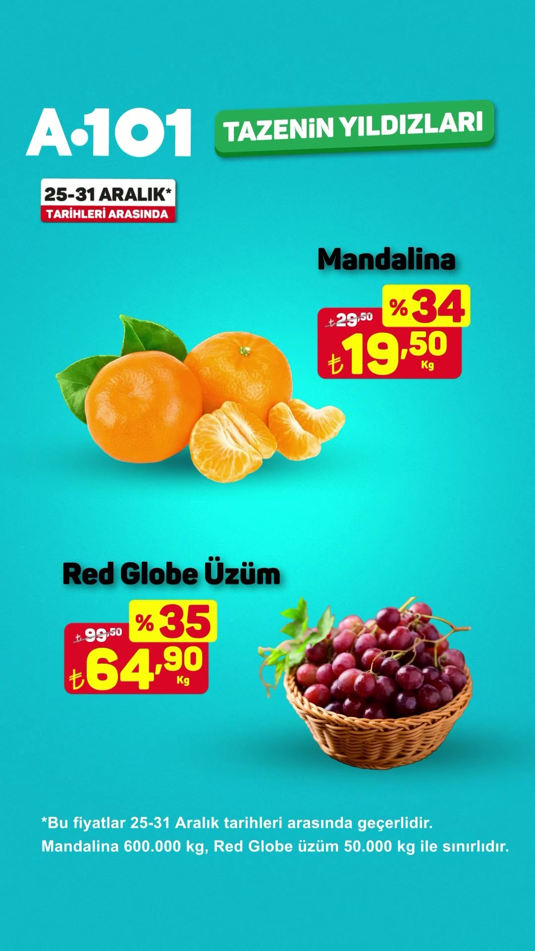 Perakende market zinciri A101 , 25 Aralık ile 31 Aralık tarihleri arasında geçerli olacak haftalık taze meyve indirimlerini duyurdu. Kampanya kapsamında, temel tüketim ürünlerinden olan mandalina ve Red Globe üzümünde önemli fiyat düşüşleri dikkat çekiyor.