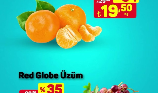 • Red Globe Üzüm: %35 indirimle 99,50 TL yerine kilogramı 64,90 TL'den müşterilere ulaştırılacak. Üzüm stoğu ise 50.000 kg ile sınırlıdır.
