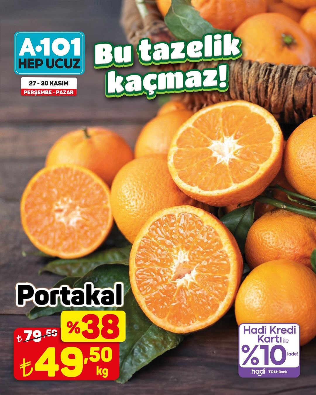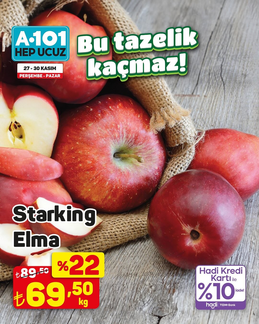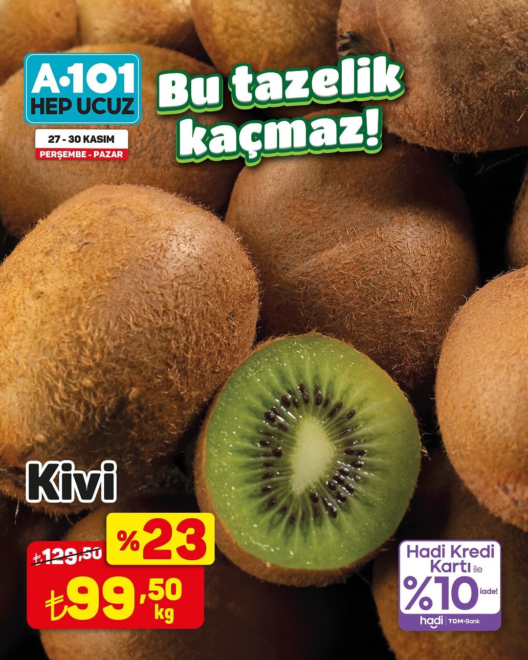 Türkiye'nin önde gelen perakende zincirlerinden A101, 27-30 Kasım tarihleri arasında geçerli olacak özel bir kampanya ile müşterilerine meyve çeşitlerinde indirim fırsatı sunuyor. Kampanya kapsamında, hem A101 mağazalarında hem de A101 Kapıda uygulaması üzerinden birçok meyve ürününde 'ucuzun da ucuzu' sloganıyla cazip fiyatlar tüketicilerin beğenisine sunulacak.Trabzon Hurması KampanyadaÖzellikle kampanya duyurusunda öne çıkan ürünlerden biri olan Trabzon hurması, kilogramı 19,95 TL'den satışa sunulacak. Bunun yanı sıra, kredi kartı ile yapılacak alışverişlerde yüzde 10 iade imkanı da sunulacak. Kampanyadan yararlanmak isteyen tüketicilerin, ürün stoklarının satış noktasına göre farklılık gösterebileceği bilgisini göz önünde bulundurmaları tavsiye ediliyor. Mağaza stoklarında bulunmayan ürünler, tüketicilerin yakınlarındaki diğer mağazalardan veya A101 Kapıda uygulaması aracılığıyla temin edilebilecek.Editör: Haber MerkeziKaynak: Sosyal Medya