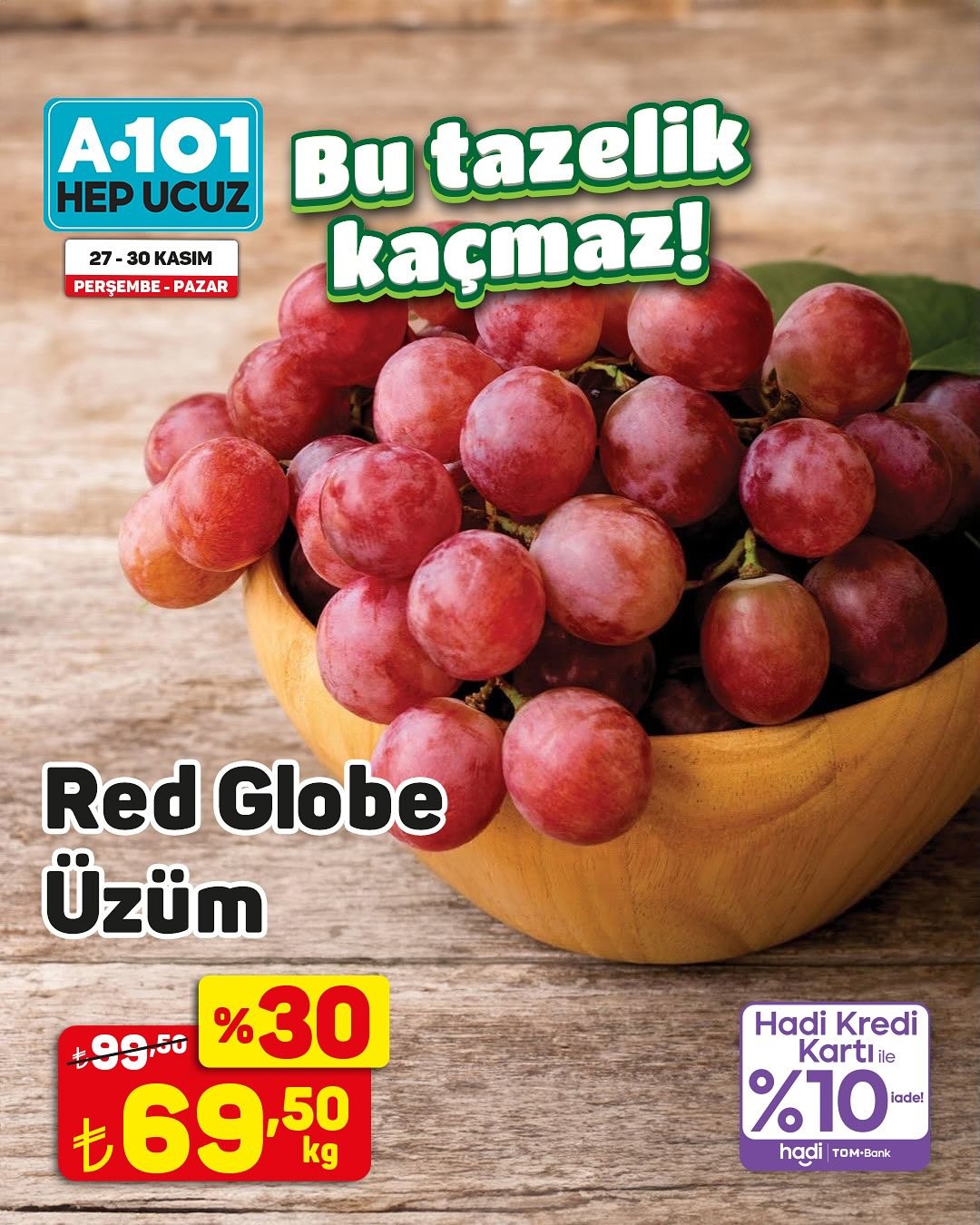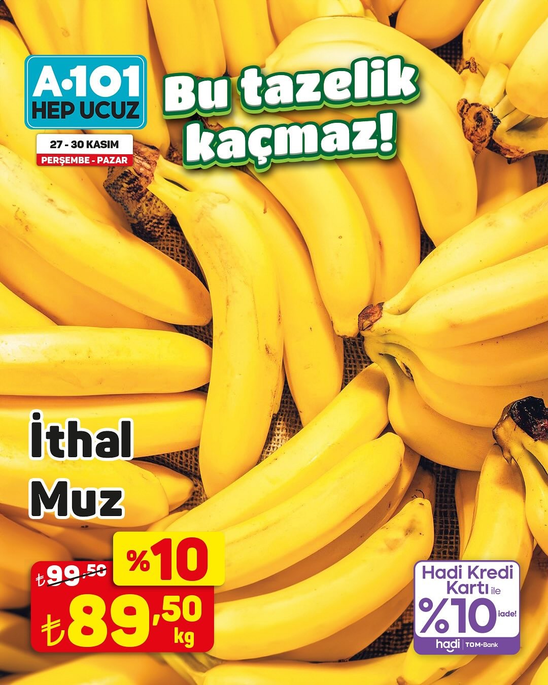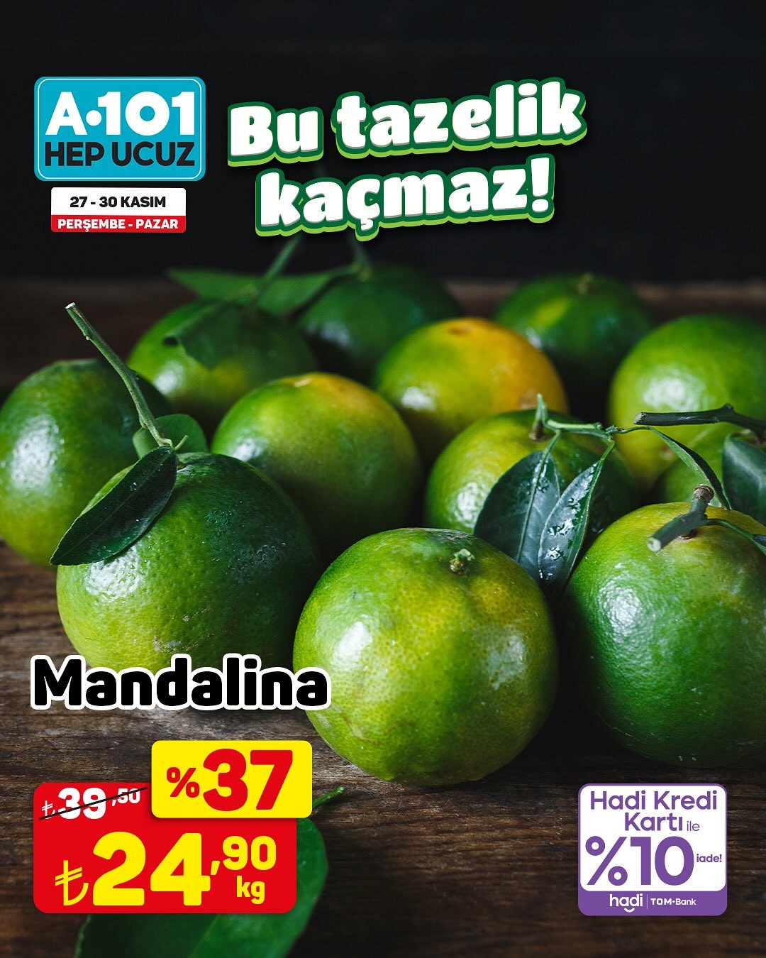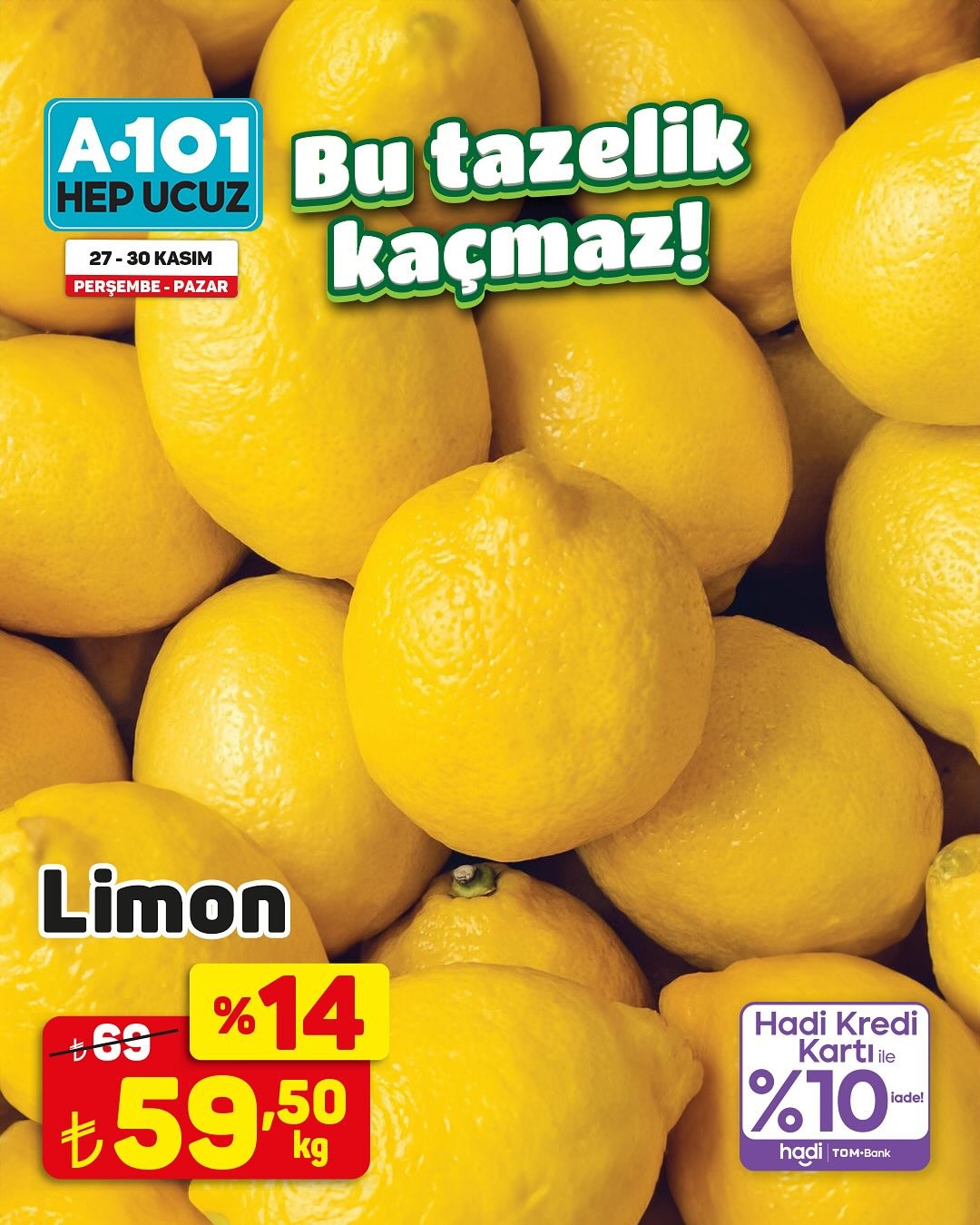 Türkiye'nin önde gelen perakende zincirlerinden A101, 27-30 Kasım tarihleri arasında geçerli olacak özel bir kampanya ile müşterilerine meyve çeşitlerinde indirim fırsatı sunuyor. Kampanya kapsamında, hem A101 mağazalarında hem de A101 Kapıda uygulaması üzerinden birçok meyve ürününde 'ucuzun da ucuzu' sloganıyla cazip fiyatlar tüketicilerin beğenisine sunulacak.Trabzon Hurması KampanyadaÖzellikle kampanya duyurusunda öne çıkan ürünlerden biri olan Trabzon hurması, kilogramı 19,95 TL'den satışa sunulacak. Bunun yanı sıra, kredi kartı ile yapılacak alışverişlerde yüzde 10 iade imkanı da sunulacak. Kampanyadan yararlanmak isteyen tüketicilerin, ürün stoklarının satış noktasına göre farklılık gösterebileceği bilgisini göz önünde bulundurmaları tavsiye ediliyor. Mağaza stoklarında bulunmayan ürünler, tüketicilerin yakınlarındaki diğer mağazalardan veya A101 Kapıda uygulaması aracılığıyla temin edilebilecek.Editör: Haber MerkeziKaynak: Sosyal Medya