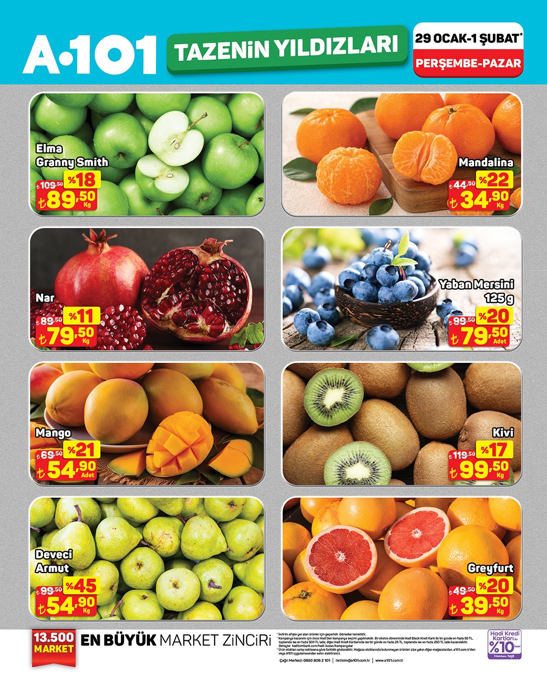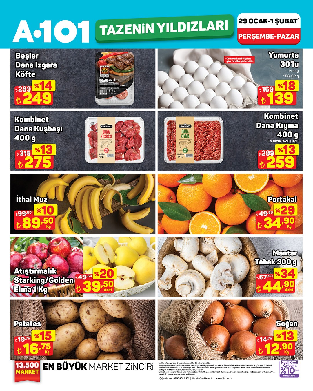 Ulusal perakende zinciri A101 , temel gıda ürünleri ve özellikle taze meyve sebzelerde geçerli olacak yeni indirim kampanyasını duyurdu. Kampanya, 29 Ocak ile 1 Şubat tarihleri arasında hem fiziksel mağazalarda hem de A101 Kapıda mobil uygulamasında geçerli olacak.Kampanyada yer alan ve A101 'in "Tazenin Yıldızları" adını verdiği ürünler arasında çeşitli meyveler dikkat çekiyor. İndirimli ürünler arasında Granny Smith Elma, Nar, Mango, Deveci Armut, Mandalina, Yaban Mersini, Kivi ve Greyfurt gibi ürünler bulunuyor.Ayrıca, et reyonunda Besler Dana Izgara Köfte ve Kombinet Dana Kuşbaşı ile Kıyma gibi ürünlerde de indirimler dikkat çekiyor. Sebzelerde ise Patates, Mantar ve Soğan gibi temel ihtiyaçlar uygun fiyatlarla raflardaki yerini aldı. Muz ve portakal da indirime dahil edilen meyveler arasında yer alıyor.A101 , alışverişlerde ödeme kolaylığı sağlamak amacıyla Hadi ile yapılan ödemelerde %10 nakit iade fırsatı sunuyor.Kampanya ile ilgili yapılan açıklamada, ürün stoklarının satış noktasına göre farklılık gösterebileceği belirtildi. Müşterilerin mağaza stoklarında bulunmayan ürünleri, kendilerine en yakın diğer mağazalardan veya A101 Kapıda uygulaması üzerinden temin edebileceği bilgisi paylaşıldı.Editör: Haber MerkeziKaynak: Sosyal Medya