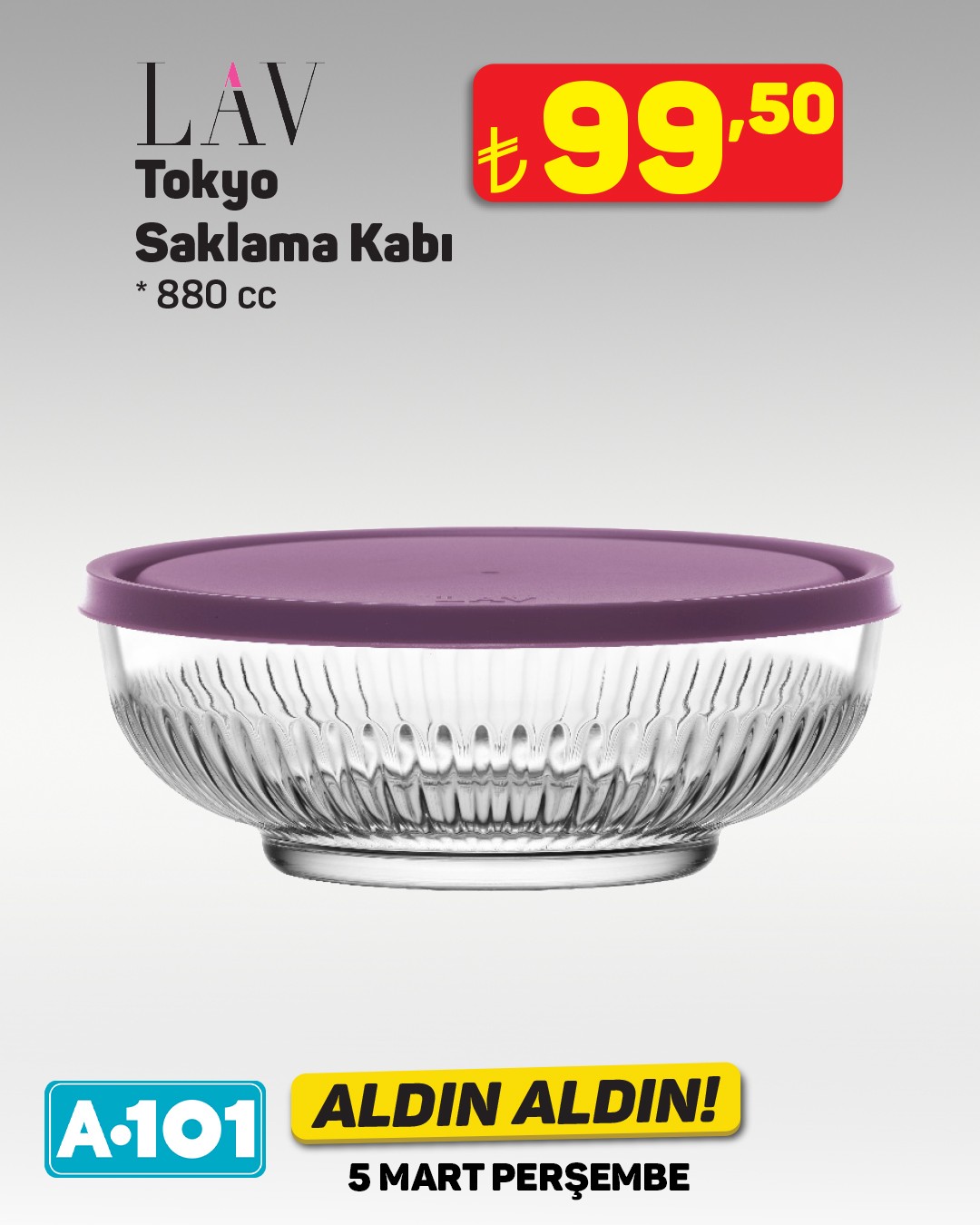 A101 marketleri, her hafta olduğu gibi bu hafta da "Aldın Aldın" kampanyasıyla müşterilerini sevindirecek. Yeni ürünler, 5 Mart Perşembe gününden itibaren A101 mağazalarında, A101 Kapıda uygulamasında ve A101 Ekstra platformunda satışa sunulacak.Bu haftanın dikkat çeken ürünlerinden biri de Lav Tokyo saklama kabı. Görselde referans olarak belirtilen 600 cc'lik Lav Tokyo saklama kabının fiyatı 74,50 TL olarak görülüyor. Kampanya kapsamında A101'in çeşitli ürünlerde indirimler sunması bekleniyor.A101'in 5 Mart'ta başlayacak olan "Aldın Aldın" kampanyası, teknoloji ürünlerinden ev eşyalarına, mutfak gereçlerinden kişisel bakım ürünlerine kadar geniş bir yelpazede fırsatlar sunacak. Geçmiş kampanyalarda olduğu gibi, bu hafta da çeşitli markalarda ürünler uygun fiyatlarla tüketicilerle buluşacak.Editör: Haber Merkezi
