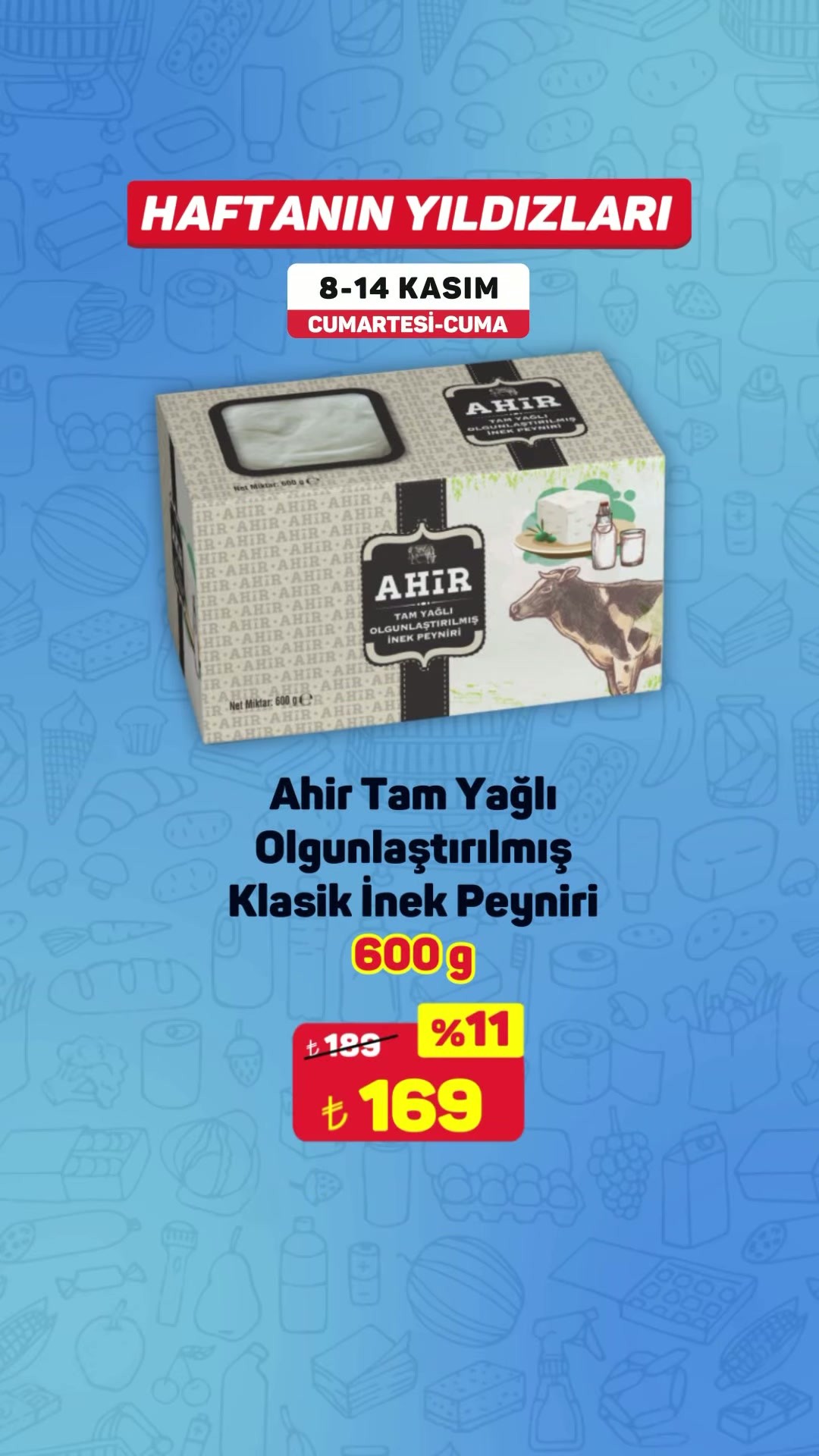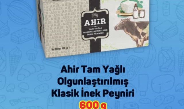 Kampanyanın öne çıkan ürünlerinden biri de 'Ahır Tam Yağlı Olgunlaştırılmış Klasik İnek Peyniri'. 600 gramlık ürün, 193 TL'den satışa sunulurken, '+169' ibaresiyle bir önceki fiyatına göre 11%'lik bir indirimin uygulandığı belirtiliyor.