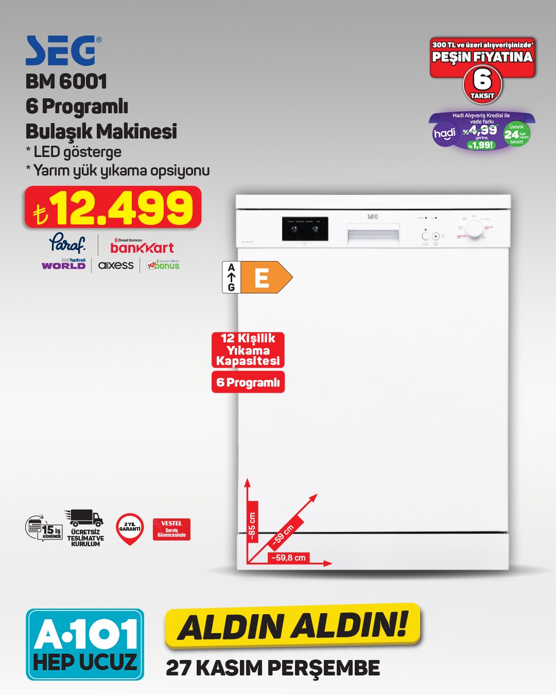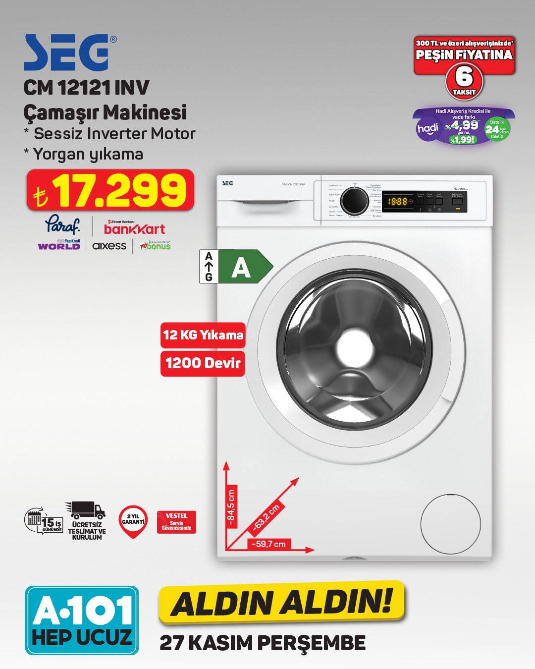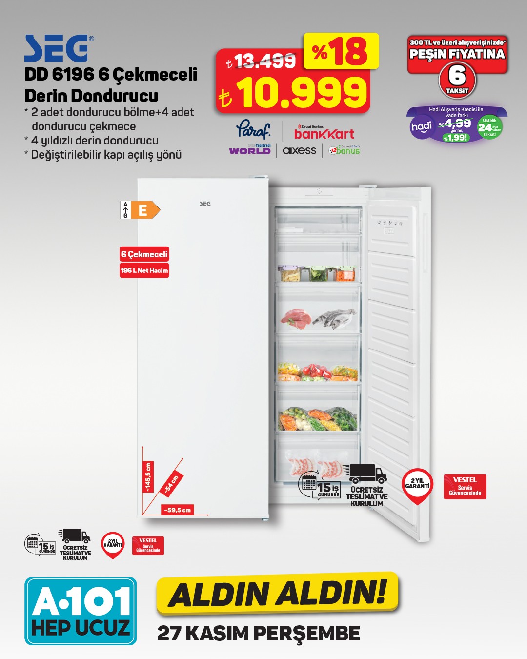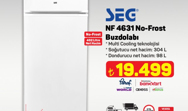 A101 market zinciri, yeni haftanın 'Aldın Aldın' ürünlerini duyurdu. Kampanya, 27 Kasım Perşembe gününden itibaren A101 mağazalarında ve A101 Ekstra platformunda geçerli olacak.Kampanyada yer alan ürünler arasında Vestel markasına ait SEG No-Frost Buzdolabı dikkat çekiyor. 402 litre net hacme sahip buzdolabı, Multi Cooling teknolojisi ile birlikte 19.499 TL'den satışa sunulacak. Ürün, 15 iş gününde ücretsiz teslimat ve kurulum ile 2 yıl garanti kapsamında olacak.A101'den yapılan açıklamada, ürün stoklarının satış noktasına göre farklılık gösterebileceği belirtildi. Mağaza stoklarında bulunmayan ürünlerin A101 Ekstra veya A101 Kapıda uygulaması üzerinden temin edilebileceği ifade edildi.Ayrıca, 300 TL ve üzeri alışverişlerde Hadi Alışveriş Kredisi ile peşin fiyatına 6 taksit imkanı sunuluyor. Bu kredi ile vade farkı olmadan 24 ay taksitli ödeme seçeneği de mevcut.Editör: Haber MerkeziKaynak: Sosyal Medya