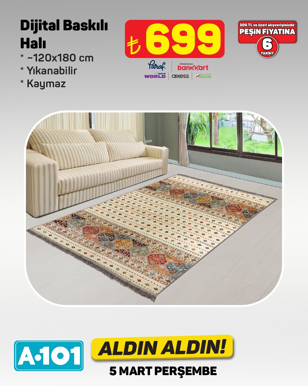A101 marketler zinciri, her hafta merakla beklenen 'Aldın Aldın' kampanyasını bu kez 5 Mart Perşembe günü başlatıyor. Kampanya kapsamında çeşitli ürünler A101 mağazalarında ve A101 Ekstra platformunda satışa sunulacak.Bu haftanın öne çıkan ürünlerinden biri, dijital baskılı ve yıkanabilir salon halısı olacak. Yaklaşık 160x230 cm boyutlarında (4 metrekare) olan halı, kaymaz tabanıyla dikkat çekiyor.Ayrıca, A101'de 300 TL ve üzeri alışverişlerde Paraf, Bankkart, World, Axess ve Bonus kartlara özel peşin fiyatına 6 taksit imkanı sunulacak.Editör: Haber Merkezi