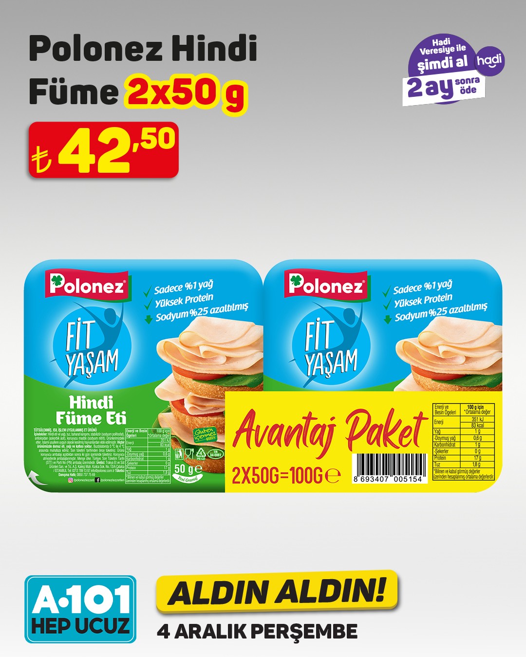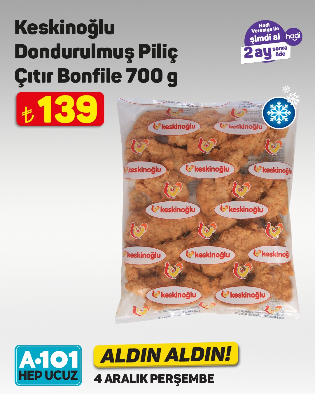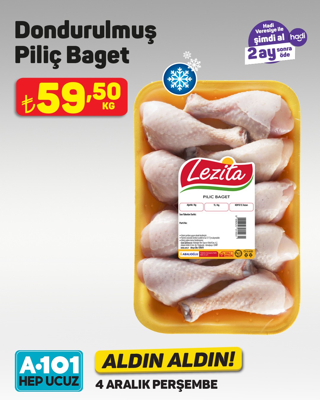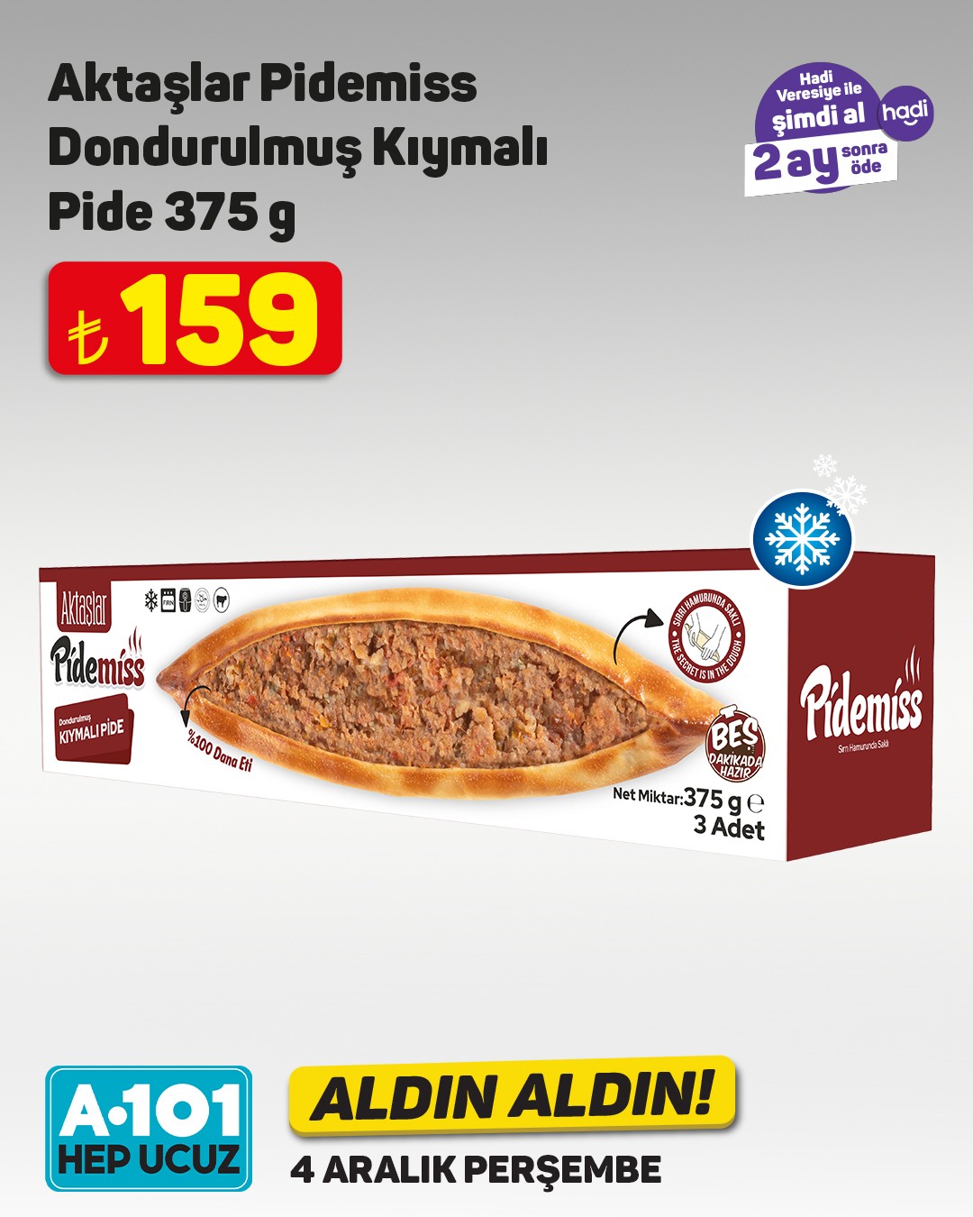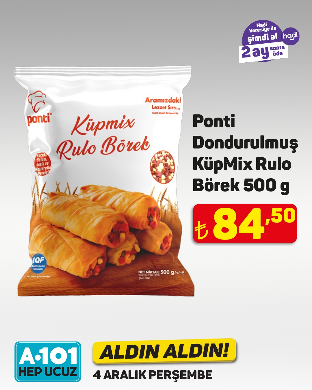 Perakende market zinciri A101, her hafta olduğu gibi bu hafta da ilgi çekecek yeni ürünleri müşterileriyle buluşturuyor. A101'in bu haftaki 'Aldın Aldın' kampanyası kapsamında dana kavurma ve bonfilet gibi et ürünleri özel fiyatlarla satışa sunulacak.4 Aralık Perşembe gününden itibaren A101 mağazalarında ve A101 Kapıda mobil uygulamasında geçerli olacak kampanyada, dana kavurma ve bonfilet uygun fiyatlarla tüketicilere sunulacak. Ürün stoklarının mağaza bazında farklılık gösterebileceği belirtilirken, stokta bulunmayan ürünlerin A101 Kapıda uygulamasından veya yakındaki diğer mağazalardan temin edilebileceği ifade edildi.Kampanya dahilinde ayrıca 'Hadi Veresiye' seçeneğiyle peşinatsız, 2 ay sonra ödeme imkanı da sunuluyor.Editör: Haber MerkeziKaynak: Sosyal Medya