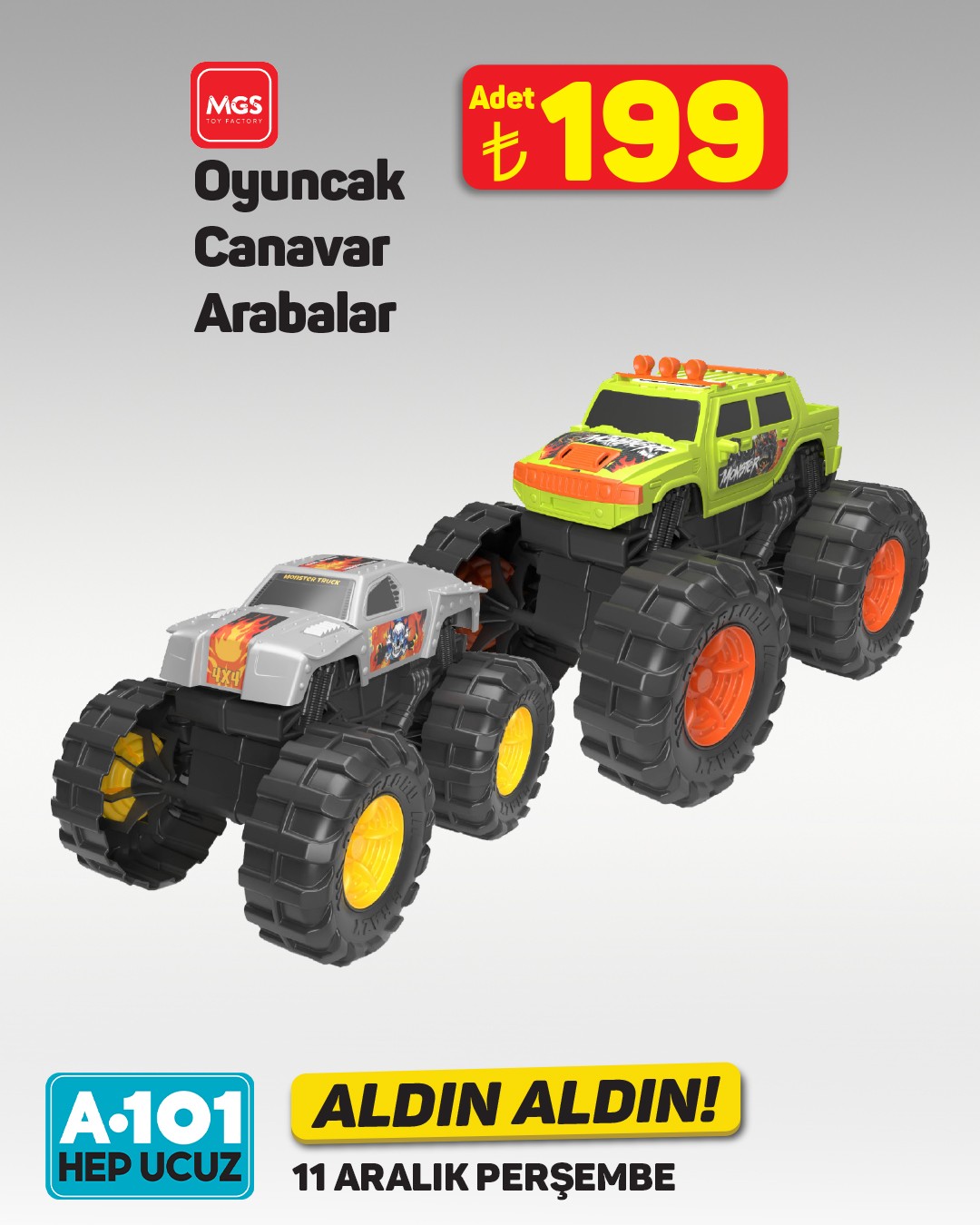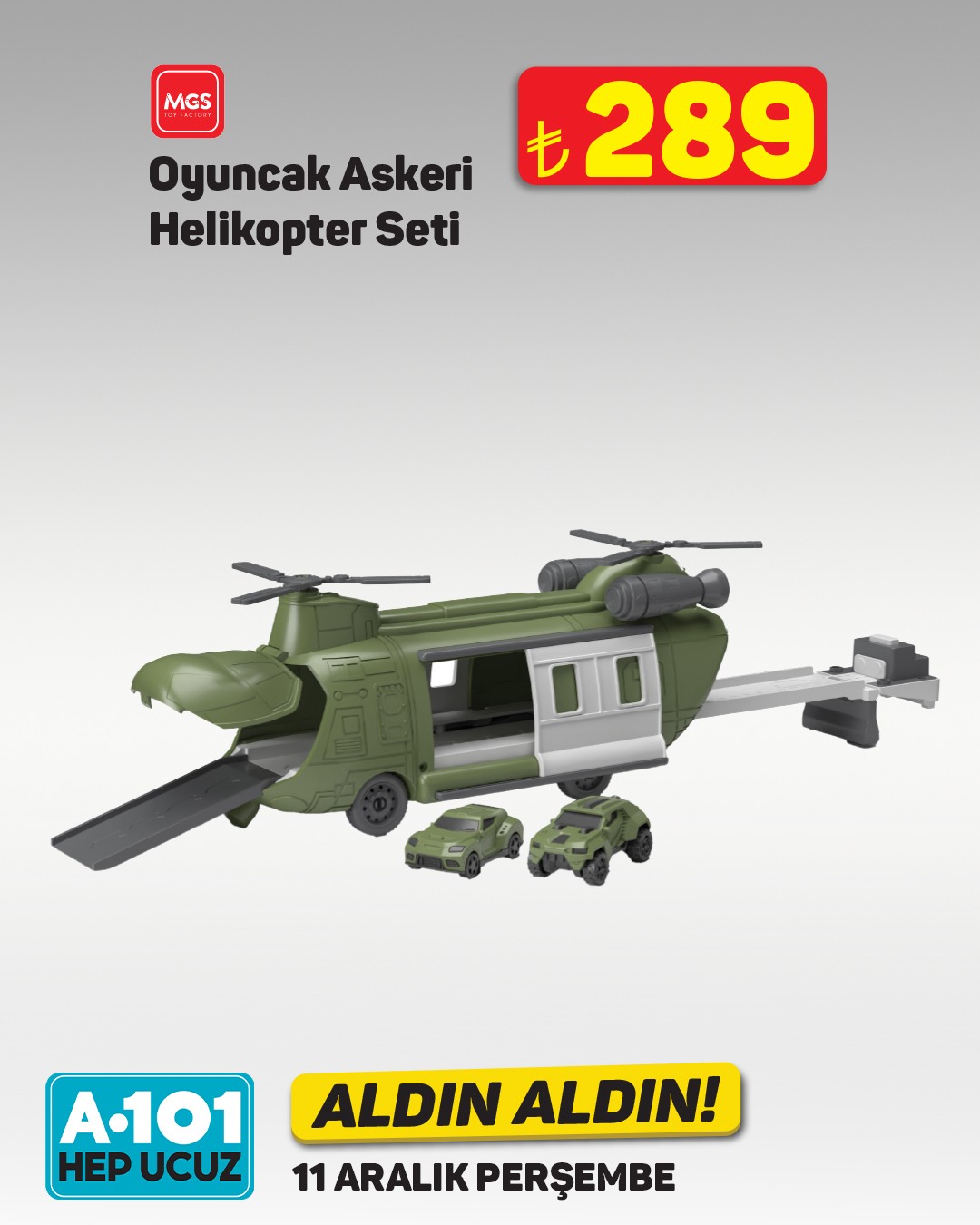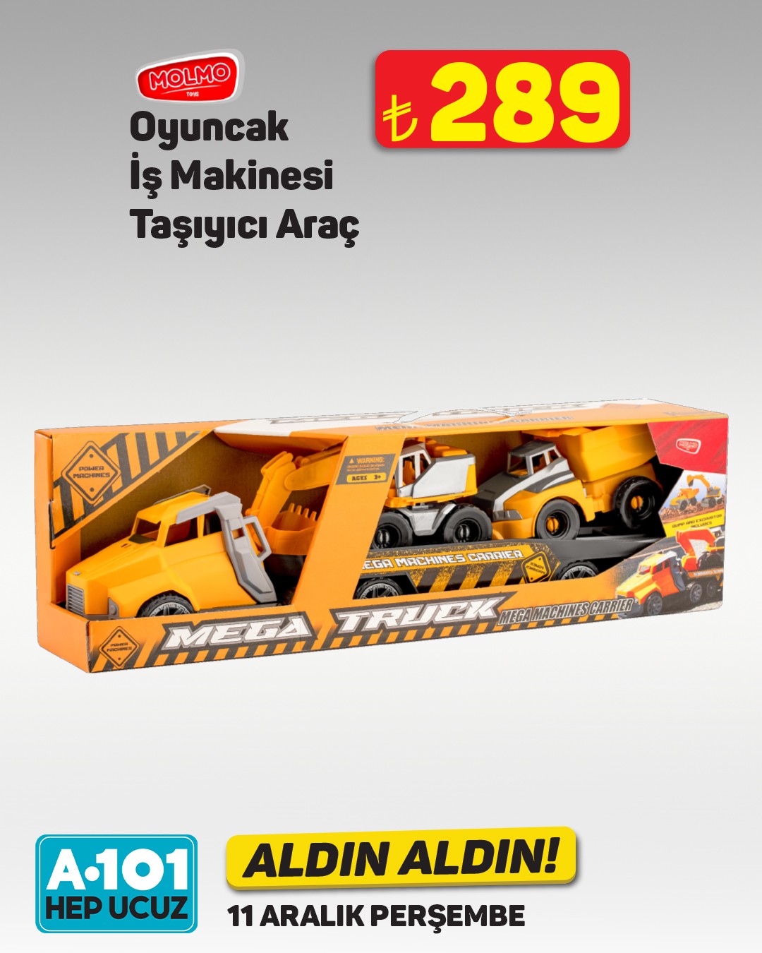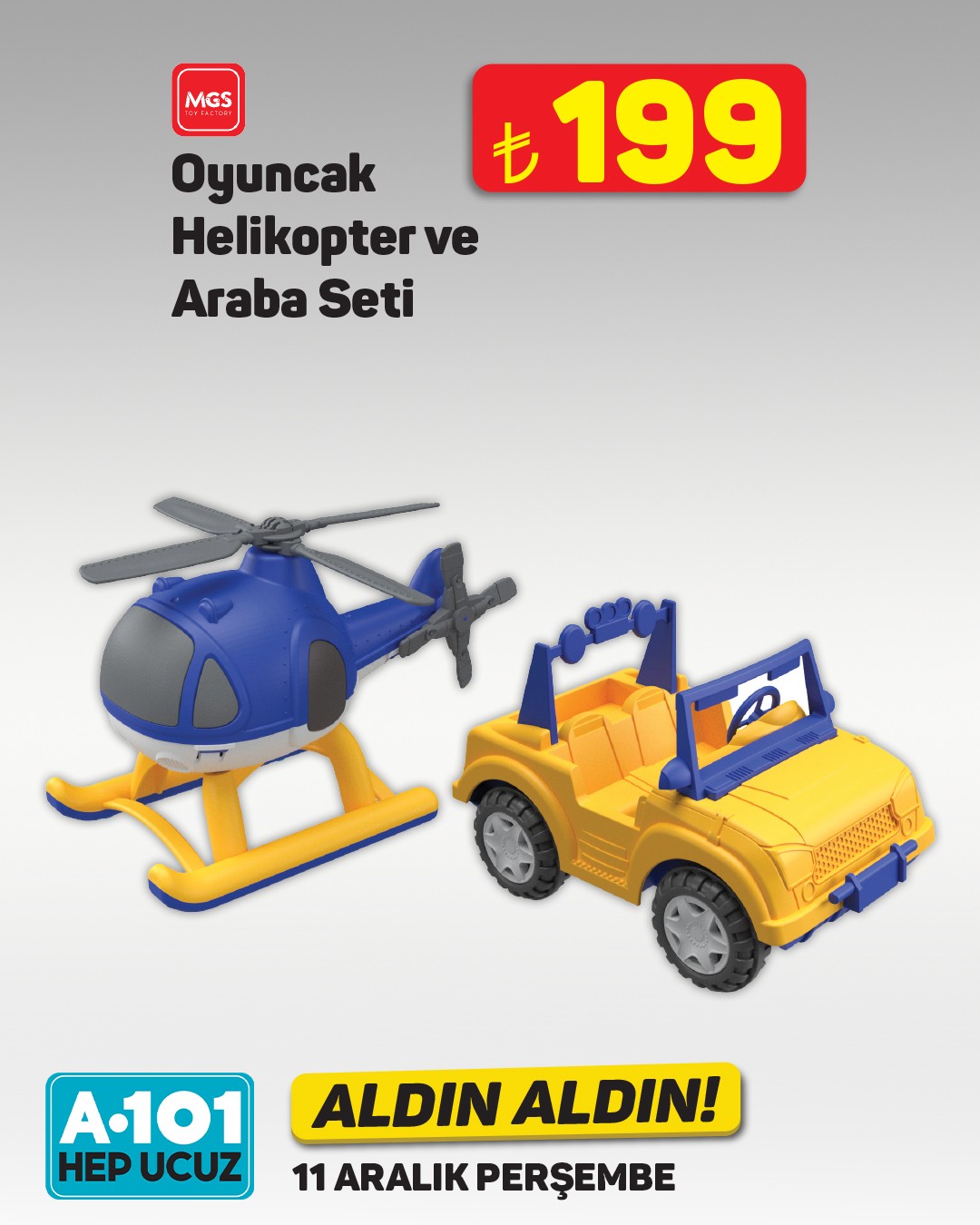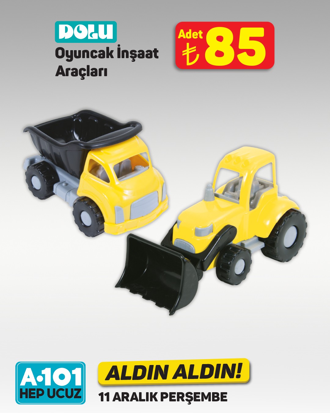 A101, 11 Aralık'tan itibaren geçerli olacak "Aldın Aldın" kampanyasıyla bebeklere yönelik çeşitli oyuncakları müşterilerine sunacak. Kampanya, mağazaların yanı sıra A101 Kapıda ve A101 Ekstra platformlarında da geçerli olacak.