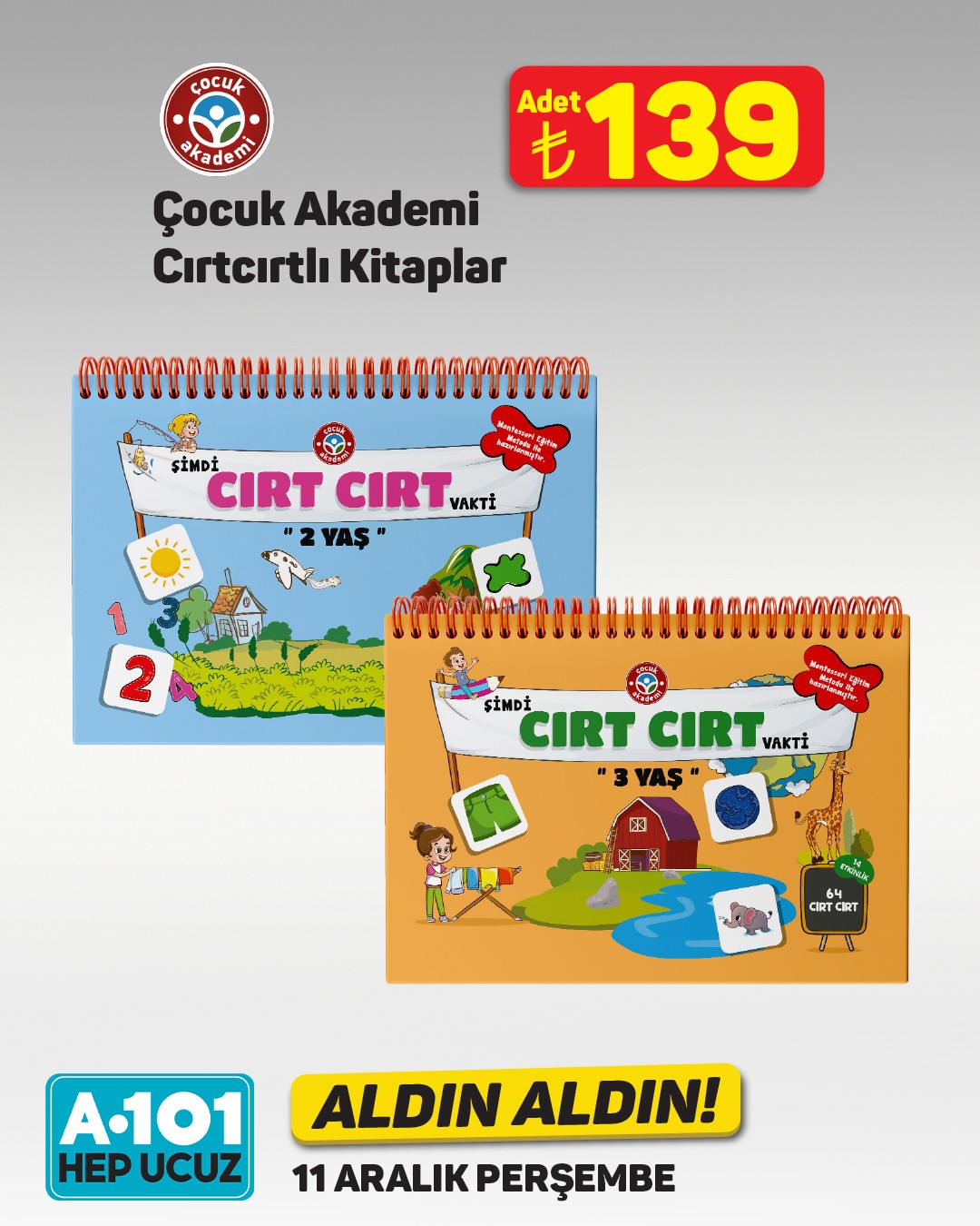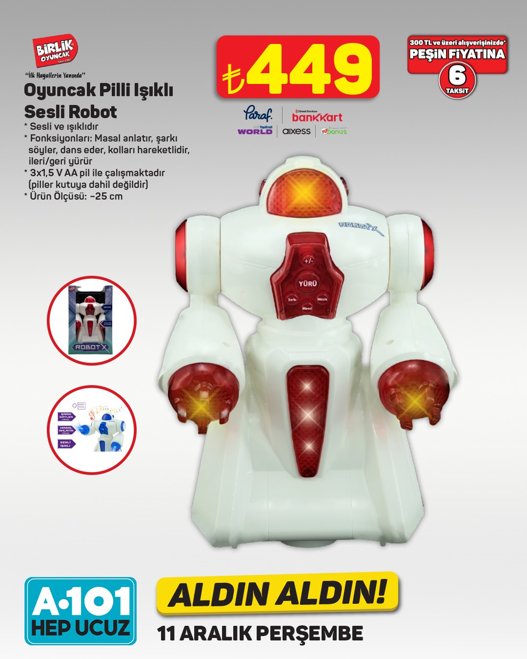 11 Aralık Perşembe gününden itibaren A101 mağazalarında, A101 Kapıda uygulamasında ve A101 Ekstra'da satışa sunulacak olan ürünler arasında, birçok farklı çeşit oyuncak bulunuyor. Bebeklerin gelişimine katkı sağlayacak hışırtılı ilk kitaplar, uç kısmında diş kaşıyıcı bulunan ürünler ve takma halkası olan oyuncaklar dikkat çekiyor.