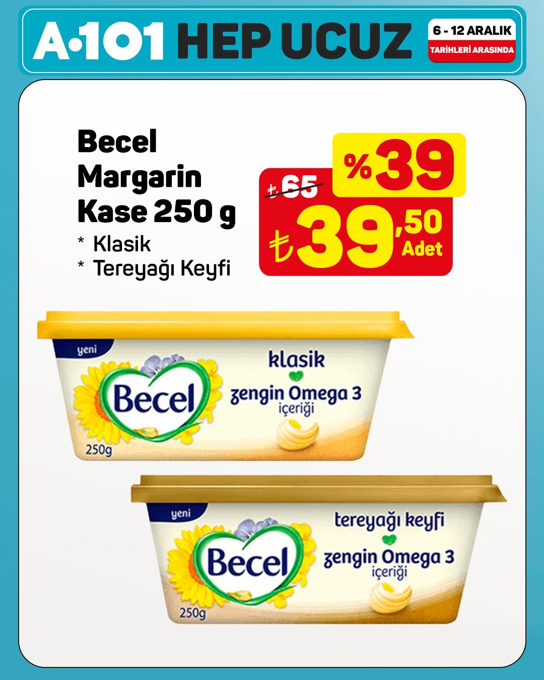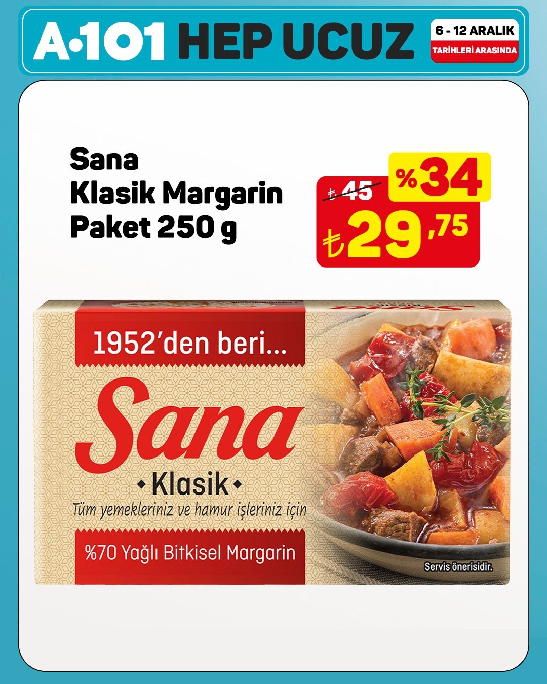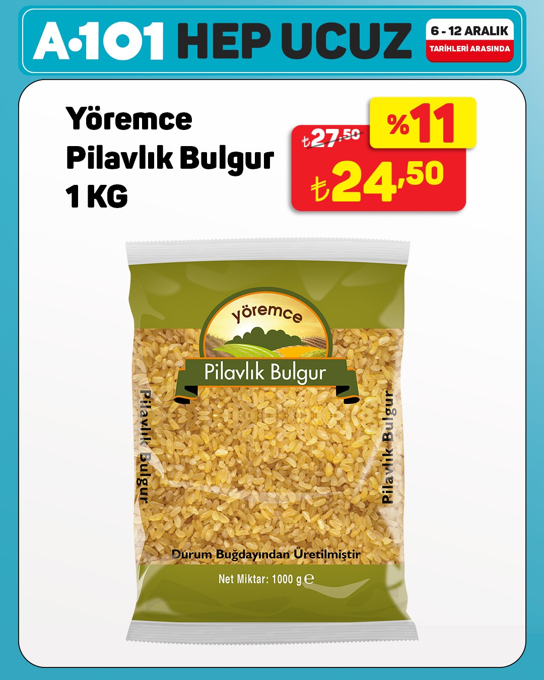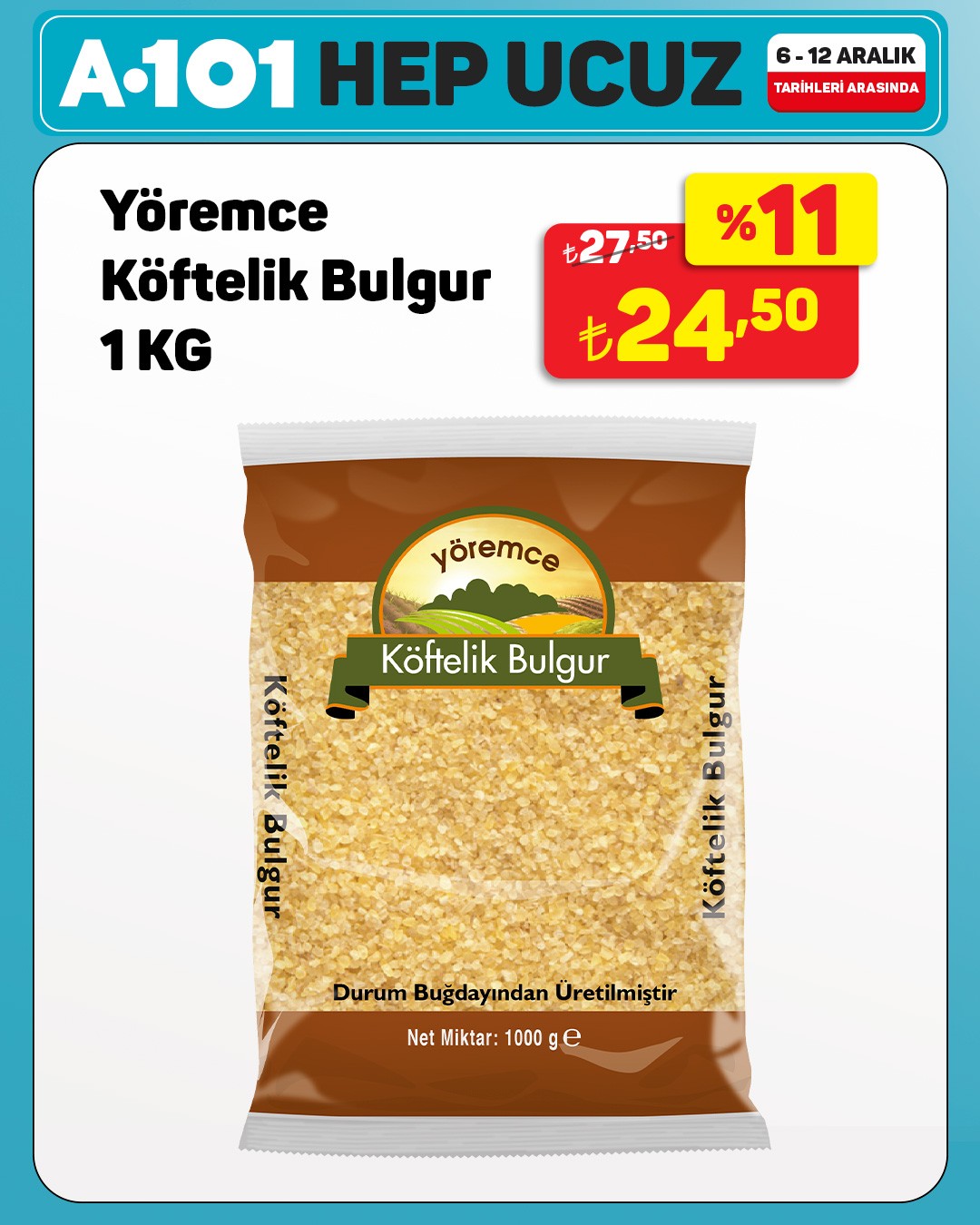 A101 marketleri, 6 - 12 Aralık tarihleri arasında geçerli olacak indirimli ürünlerini duyurdu. Müşteriler, hem mağazalarda hem de A101 Kapıda uygulaması üzerinden belirtilen ürünlere avantajlı fiyatlarla ulaşabilecek.Kampanya kapsamında, yöremce markalı kırmızı mercimek 1 kg ürününde özel indirimler yer alıyor. Normal fiyatı £44,50 olan ürün, kampanya süresince £39,50'dan satışa sunulacak.A101, ürün stoklarının satış noktasına göre farklılık gösterebileceğini belirtti. Mağaza stoklarında bulunmayan ürünler ise müşterilere yakın diğer mağazalardan veya A101 Kapıda uygulaması üzerinden temin edilebilecek.Editör: Haber MerkeziKaynak: Sosyal Medya