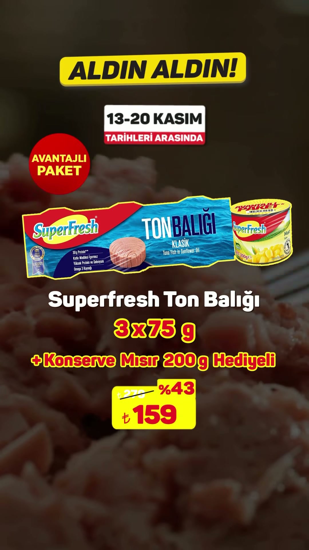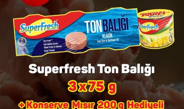 Kampanya kapsamında Superfresh Ton Balığı Klasik (ayçiçek yağlı) 3x75 gramlık avantajlı paket, 159 TL fiyatla tüketicilere sunuluyor. Üstelik bu pakete 200 gramlık konserve mısır da hediye ediliyor. Orijinal fiyatı 279 TL olan ürün, %43 indirimle 159 TL'ye satışa sunuldu.