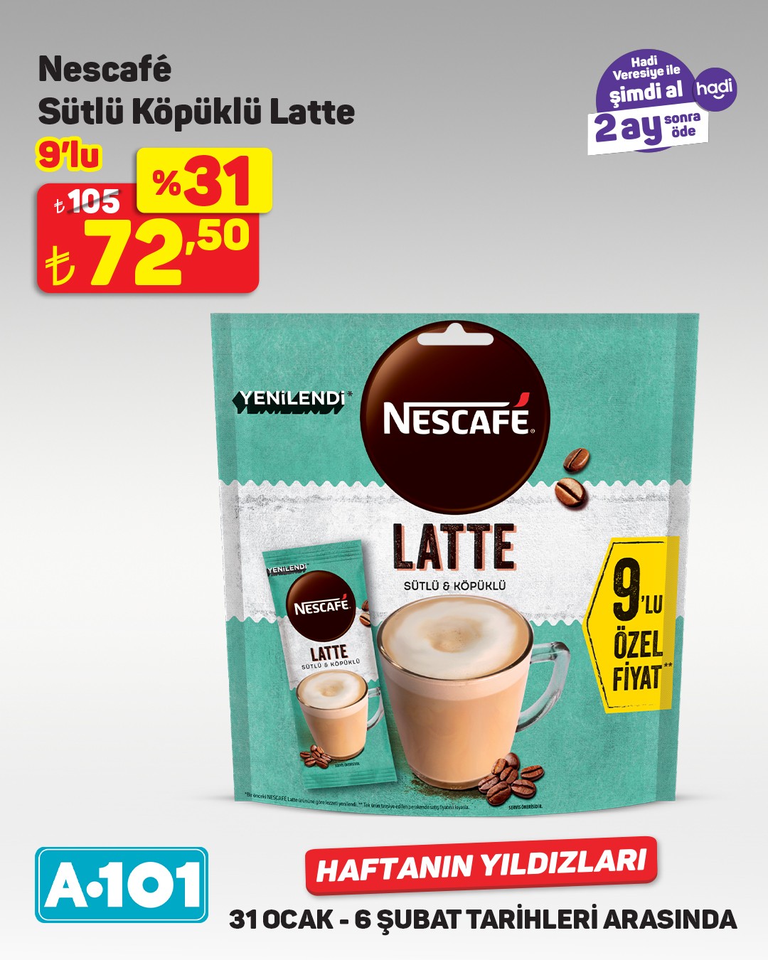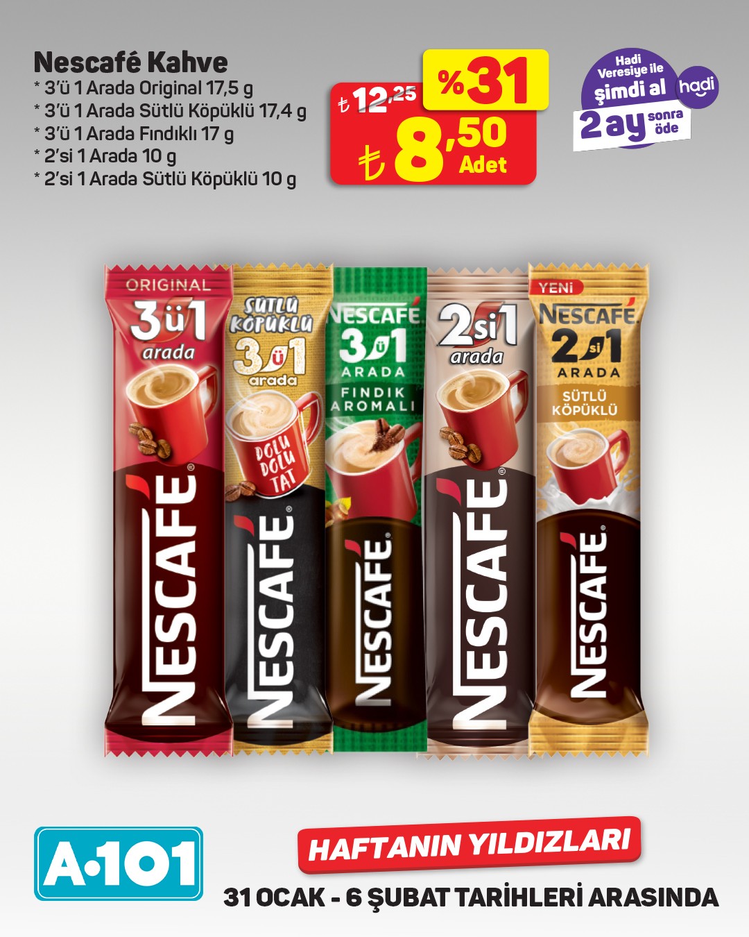 Kampanya kapsamında Nescafe'nin 10'lu paketlerde sunulan 3'ü 1 Arada Original, 2'si 1 Arada Sütlü Köpüklü, 2'si 1 Arada Zengin Tat, 3'ü 1 Arada Sütlü Köpüklü ve 3'ü 1 Arada Extra gibi farklı çeşitleri indirimli fiyatlarla satışa sunuluyor. Ürünlerin adet fiyatı 72,50 TL olarak belirtildi.A101, ürün stoklarının satış noktasına göre farklılık gösterebileceğini hatırlatarak, mağaza stoklarında bulunmayan ürünlerin yakın diğer mağazalardan veya A101 Kapıda uygulamasından temin edilebileceğini bildirdi.Editör: Haber MerkeziKaynak: Sosyal Medya