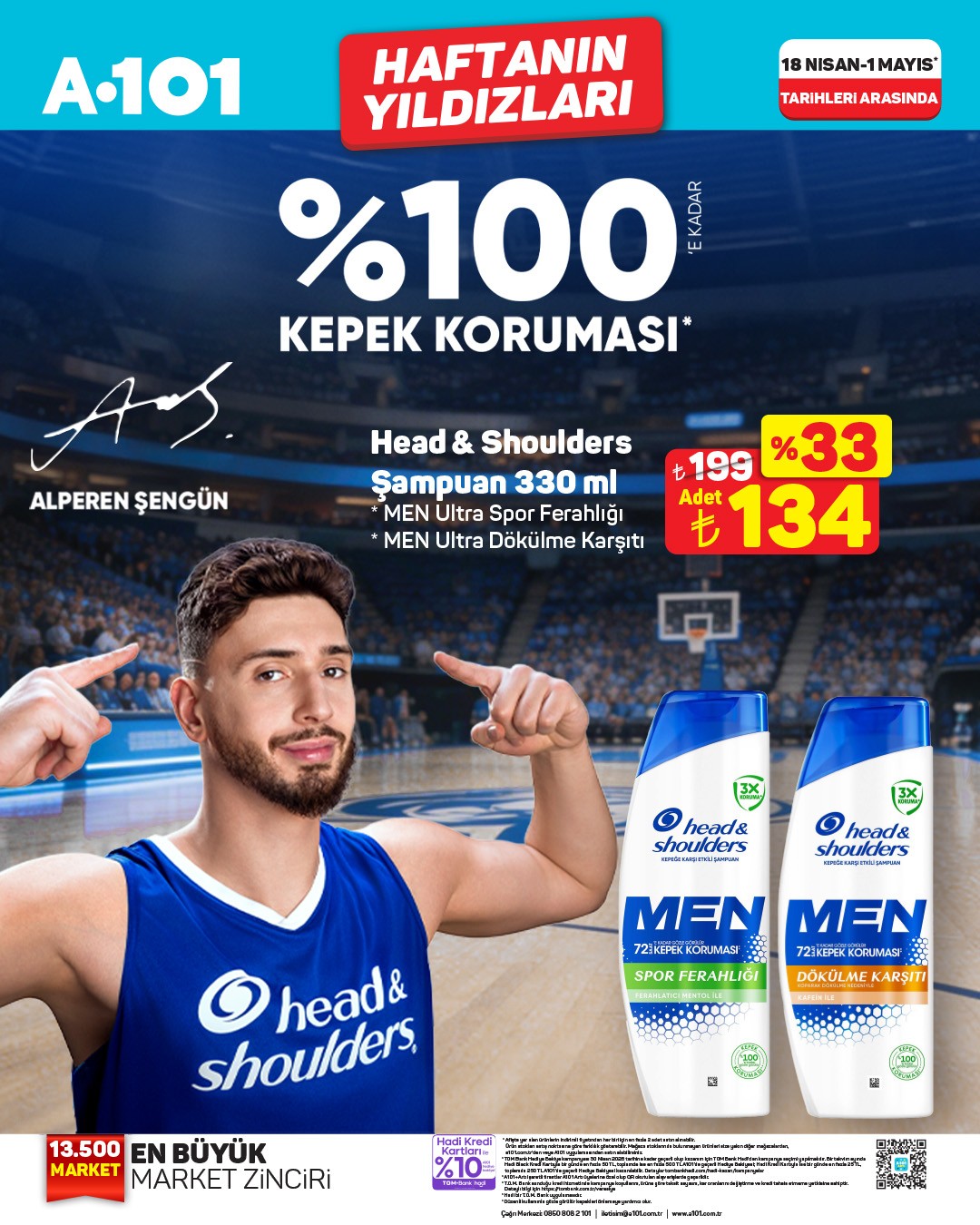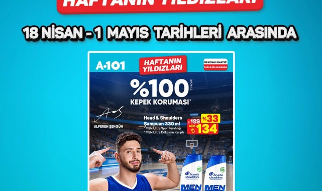 A101 market zinciri, 18 Nisan ile 1 Mayıs tarihleri arasında geçerli olacak 'Haftanın Yıldızları' kampanyasını duyurdu. Kampanya kapsamında A101 mağazalarında, A101 Kapıda uygulaması ve A101 Ekstra platformunda çeşitli ürünlerde indirimler sunulacak.Kampanyanın öne çıkan ürünleri arasında, %100 kepek koruması vaadiyle Head & Shoulders şampuanın 330 ml'lik boyu yer alıyor. Ayrıca MEN Ultra Spor Ferahlığı ve MEN Ultra Dökülme Karşıtı ürünleri de indirimli fiyatlarla satışa sunulacak. Görselde yer alan bilgilere göre, Head & Shoulders şampuan 134 TL'den, MEN ürünleri ise 13.50 TL'den başlayan fiyatlarla tüketicilere ulaşacak.