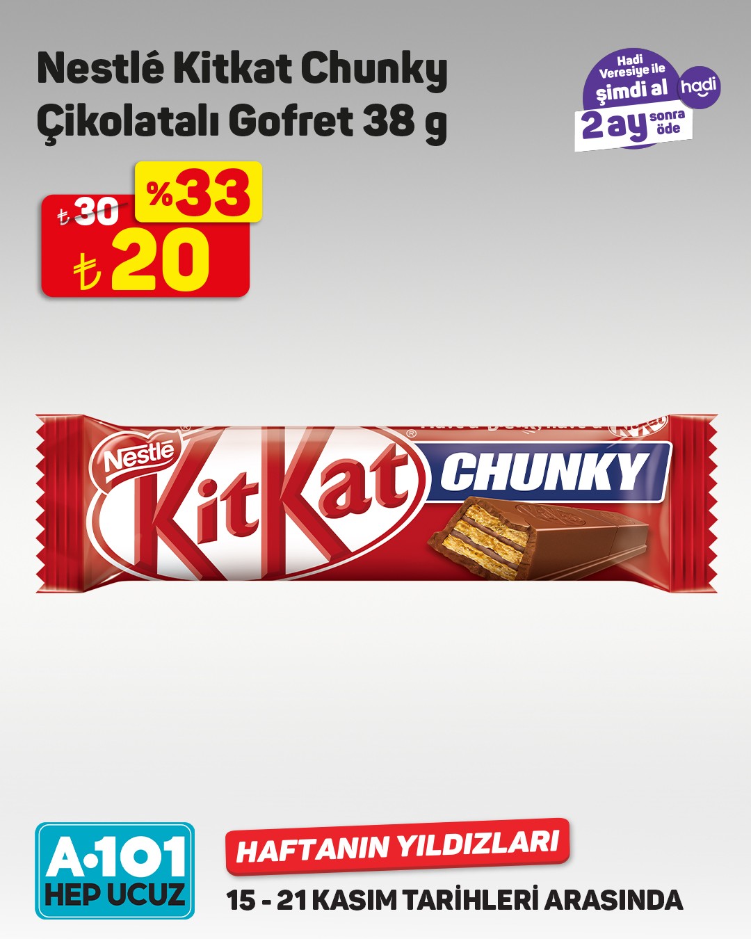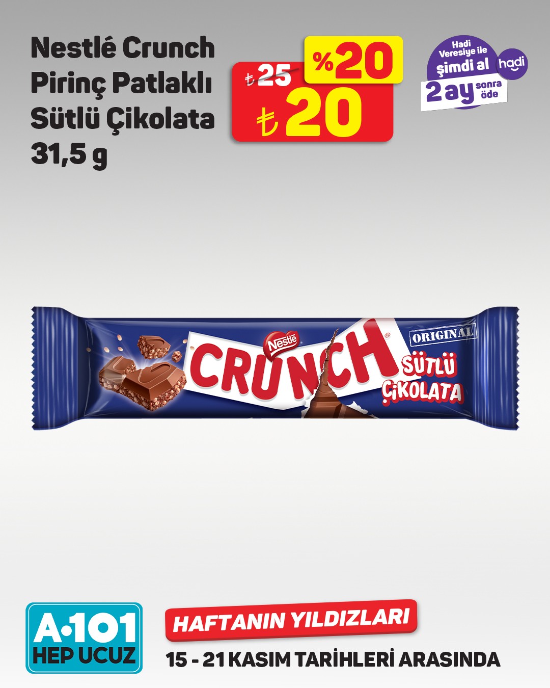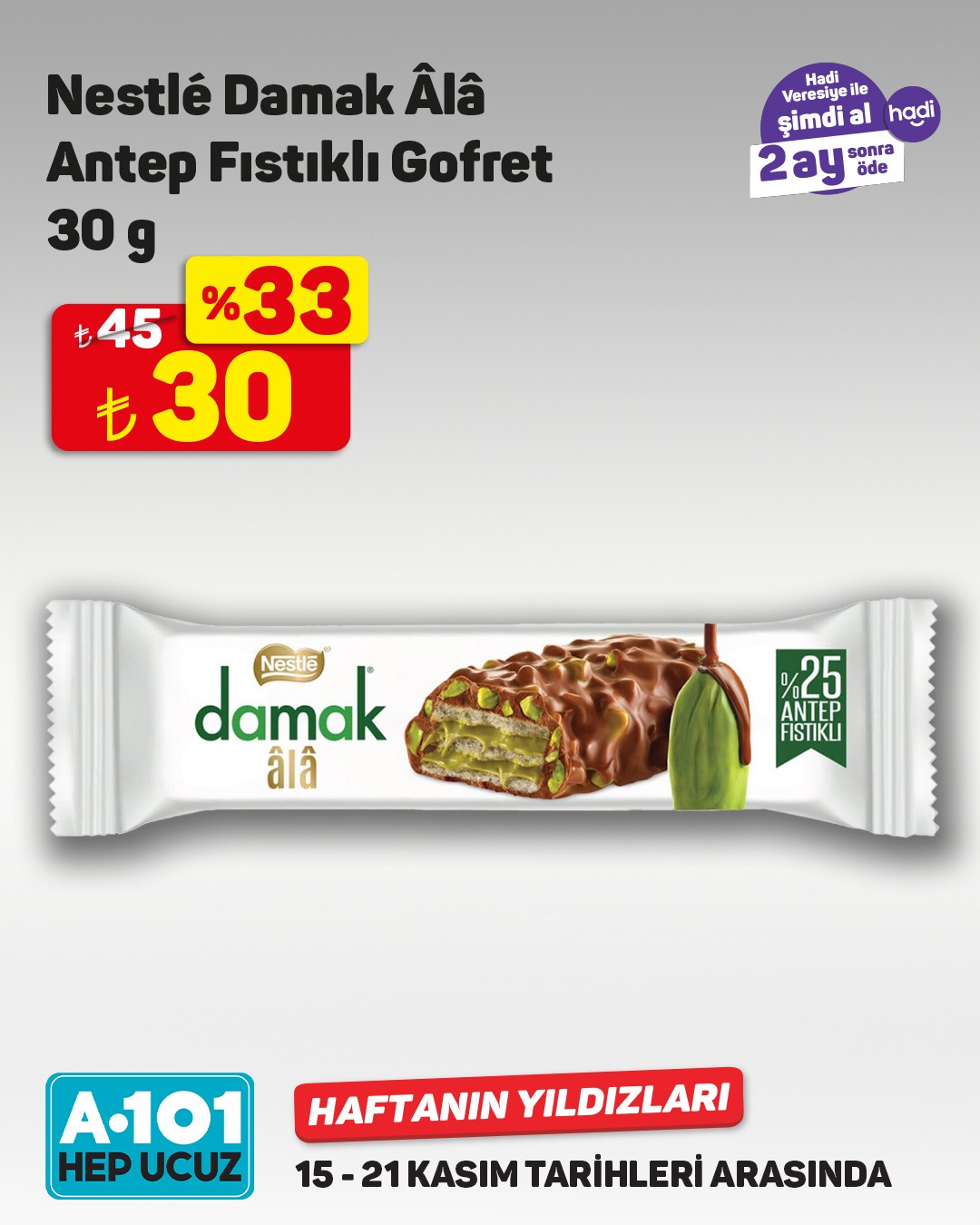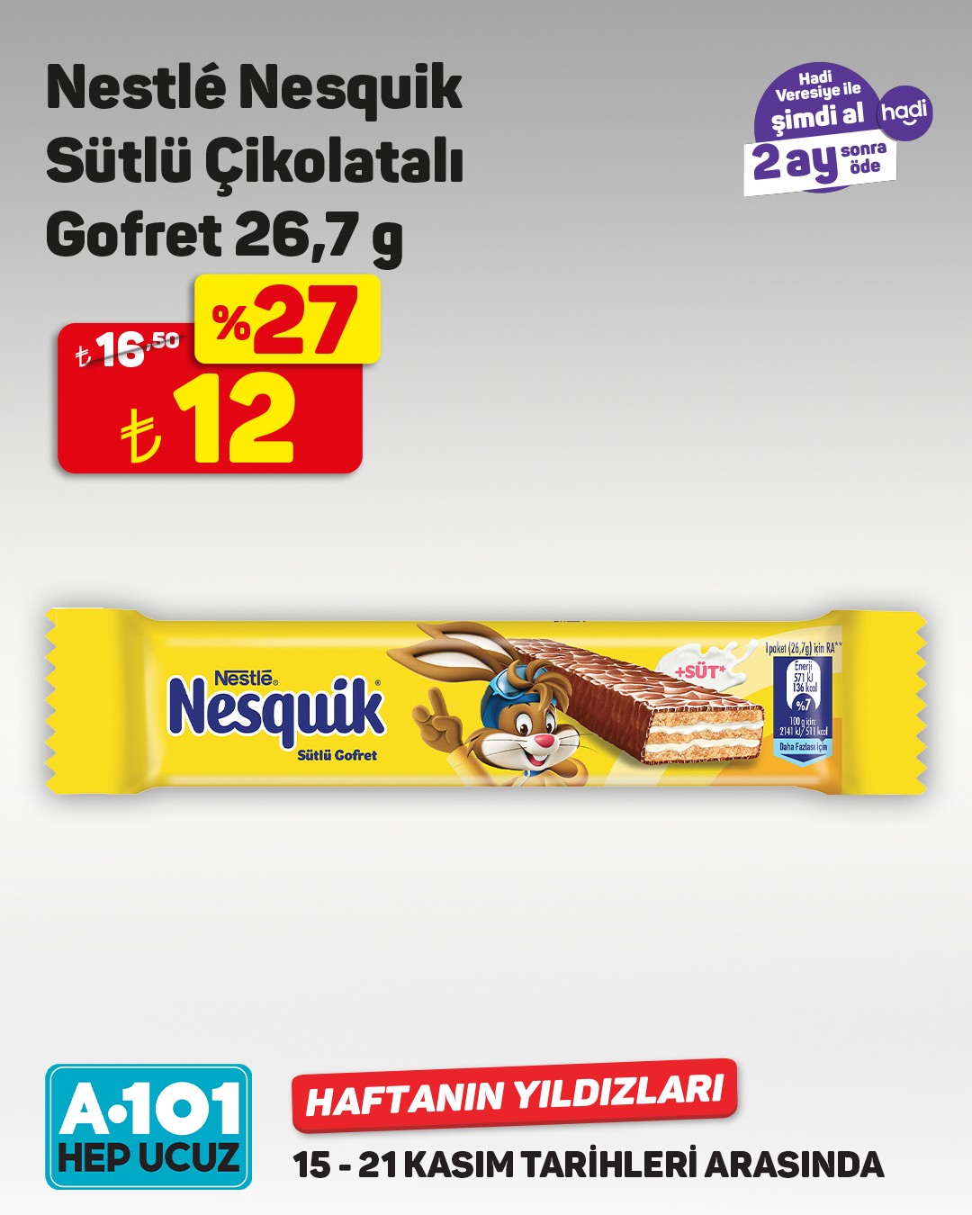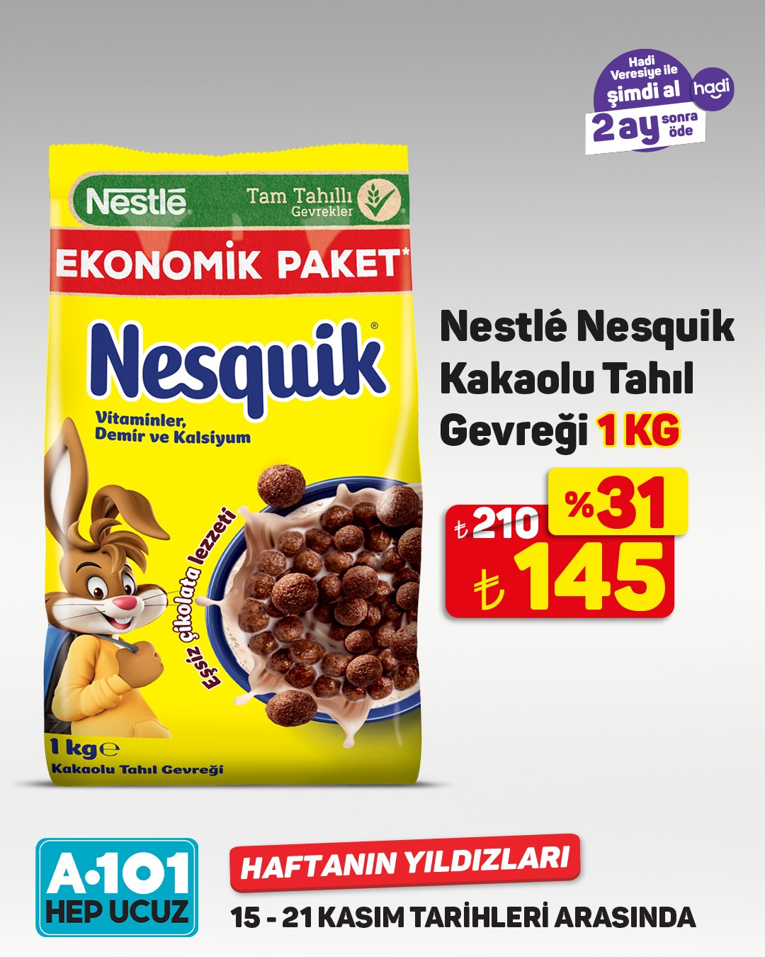 A101, 15-21 Kasım tarihleri arasında geçerli olacak 'Haftanın Yıldızları' kampanyasını başlattı. Kampanya kapsamında müşterilere, 'Hadi Veresiye' ile şimdi alıp 2 ay sonra ödeme fırsatı sunuluyor. Nescafé Matinal Kahve'de %46 indirim dikkat çekiyor.