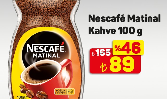 Kampanyaya özel olarak Nescafé Matinal Kahve 100 gr ürününün %46 indirimle ₺89'dan satışa sunulacağı duyuruldu. Bu yeni kampanya ile A101, müşterilerine ekonomik alışveriş imkanları sunmaya devam ediyor.