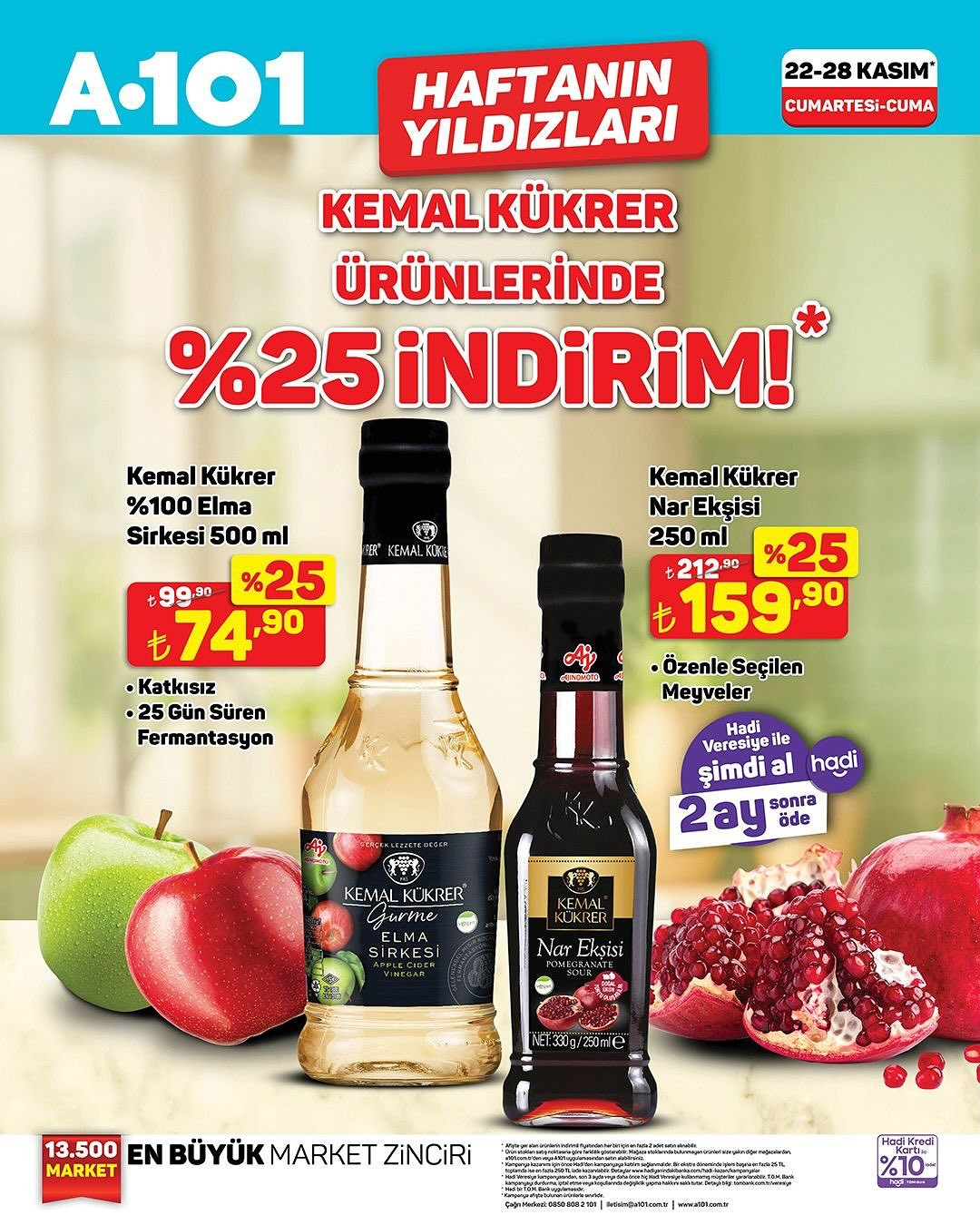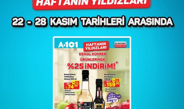 Market zinciri A101, 22-28 Kasım tarihleri arasında geçerli olacak "Haftanın Yıldızları" kampanyasını duyurdu. Kampanya kapsamında A101 mağazalarında, A101 Kapıda uygulaması ve A101 Ekstra platformunda Kemal Kükrer markalı ürünlerde %25'e varan indirim fırsatı sunuluyor.Kampanyada Yer Alan Ürünler ve Fiyatlar