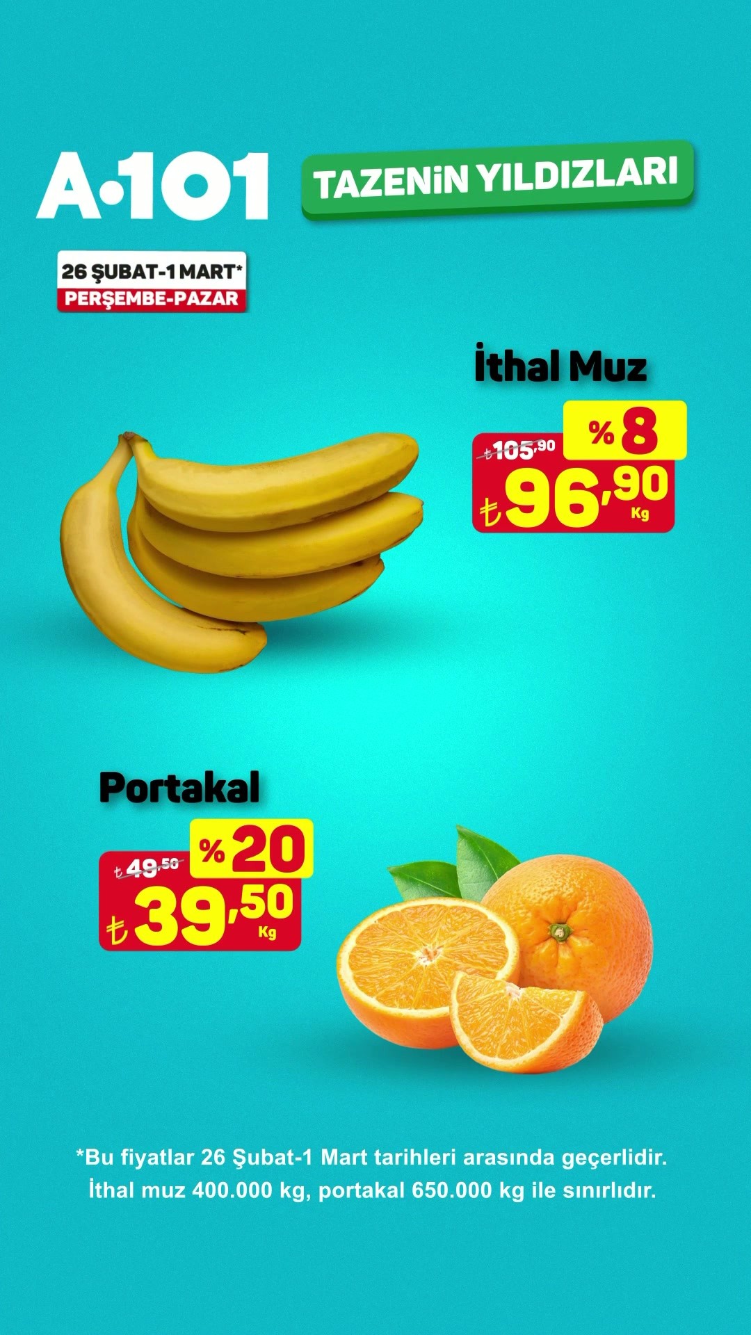 A101 tarafından yapılan açıklamada, ithal muz için 400.000 kg, portakal için ise 650.000 kg stok bulunduğu belirtildi. Bu indirimli ürünlerin stoklarla sınırlı olduğu vurgulandı.