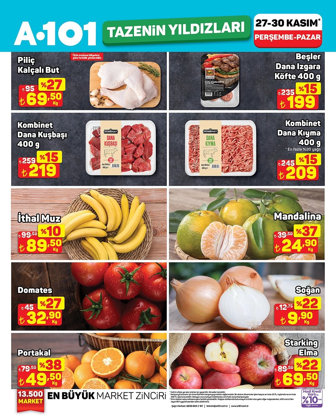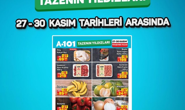 A101 marketleri ve A101 Kapıda uygulaması, 27-30 Kasım tarihleri arasında geçerli olacak bir kampanya ile meyve ve sebzelerde cazip indirimler sunuyor. Kampanya kapsamında, tavuk kalçalı but, dana kuşbaşı, dana kıyma, dana ızgara köfte gibi et ürünlerinin yanı sıra, ithal muz, domates, portakal, mandalina, soğan ve Starking elma gibi taze ürünlerde de indirimler yer alıyor.