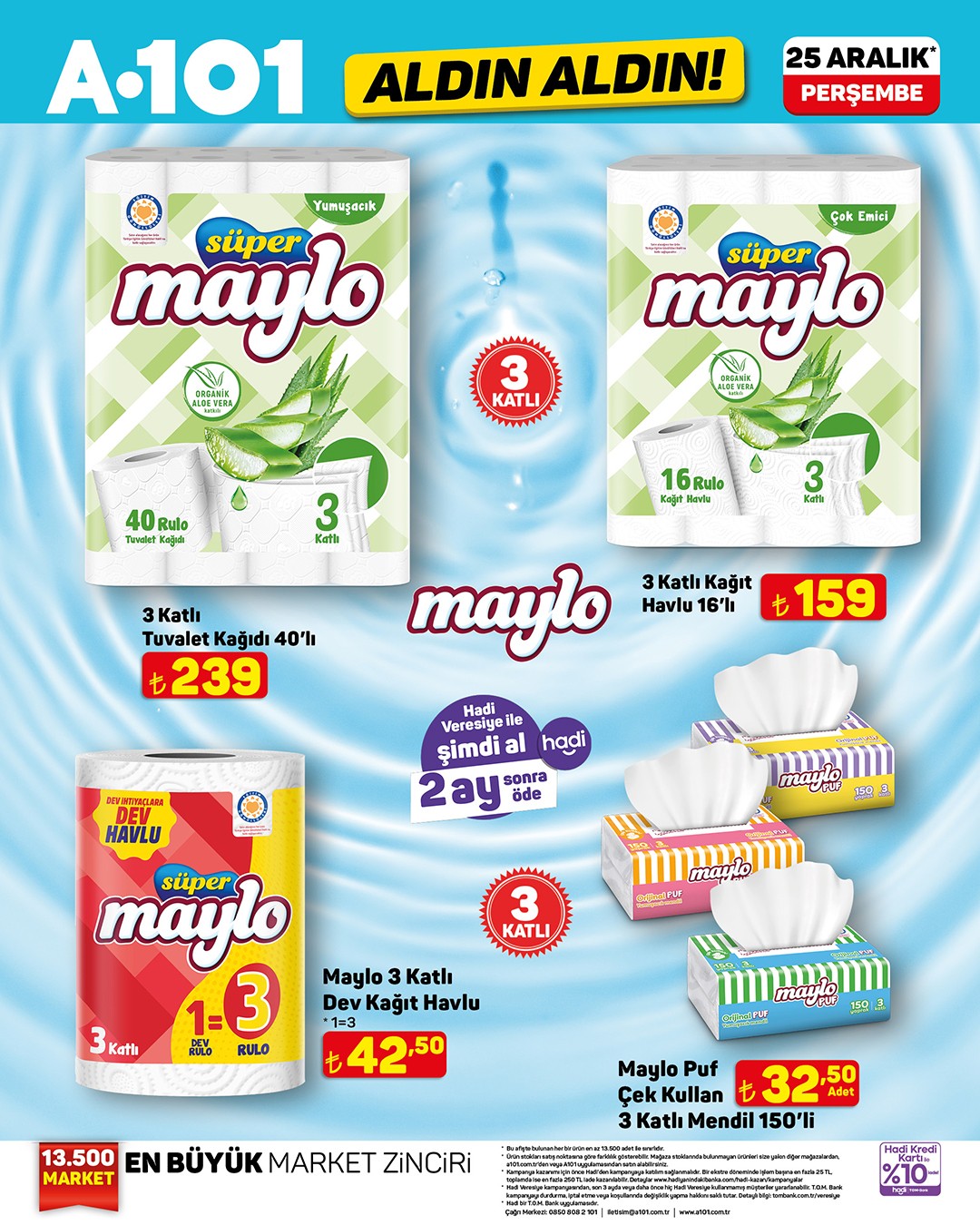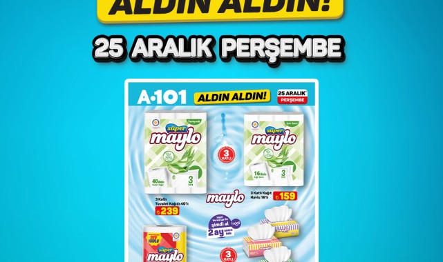 Türkiye'nin en büyük market zincirlerinden olan A101 , her hafta olduğu gibi bu hafta da dikkat çeken indirimlerini duyurdu. Market zinciri tarafından yapılan açıklamaya göre, A101 'in popüler sloganı olan "Aldın Aldın!" fırsatları 25 Aralık Perşembe gününden itibaren raflardaki yerini alacak.Kampanyalı ürünler; fiziksel mağazaların yanı sıra A101 Kapıda uygulaması ve online alışveriş platformu A101 Ekstra üzerinden de müşterilere sunulacak. A101 , stokların satış noktasına göre farklılık gösterebileceği uyarısında bulundu.İndirimli Ürünlerden Bazıları:- Maylo 3 Katlı Tuvalet Kağıdı 40'lı: ₺239