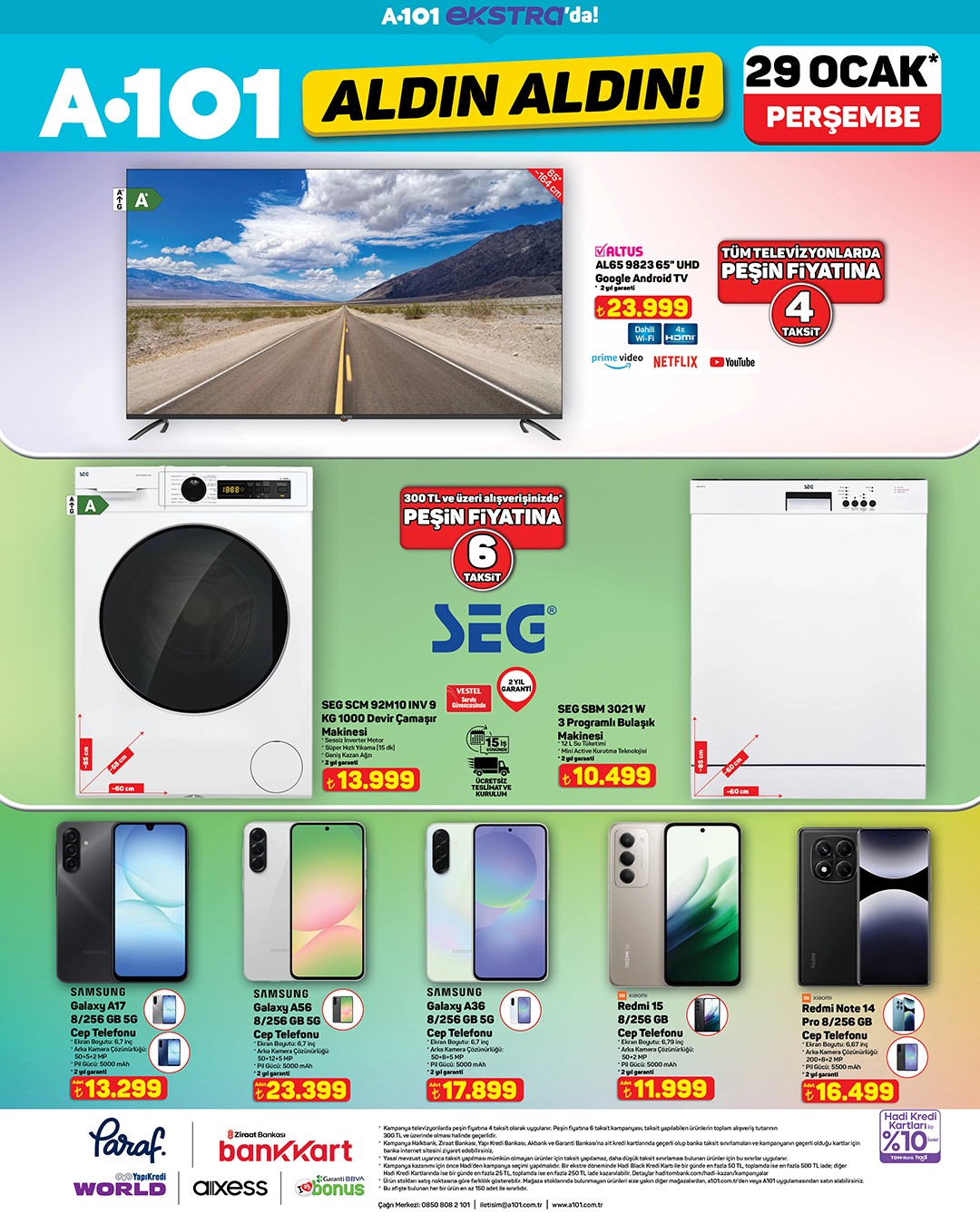 A101, 29 Ocak Perşembe günü başlayacak olan yeni 'Aldın Aldın' kampanyasını duyurdu. Kampanya kapsamında Samsung telefonlar, SEG marka televizyonlar ve ev mobilyalarında cazip fiyatlar ve taksit imkanları sunulacak.