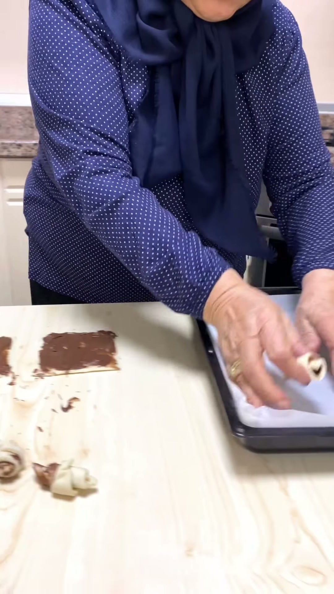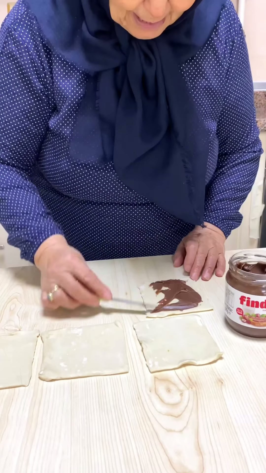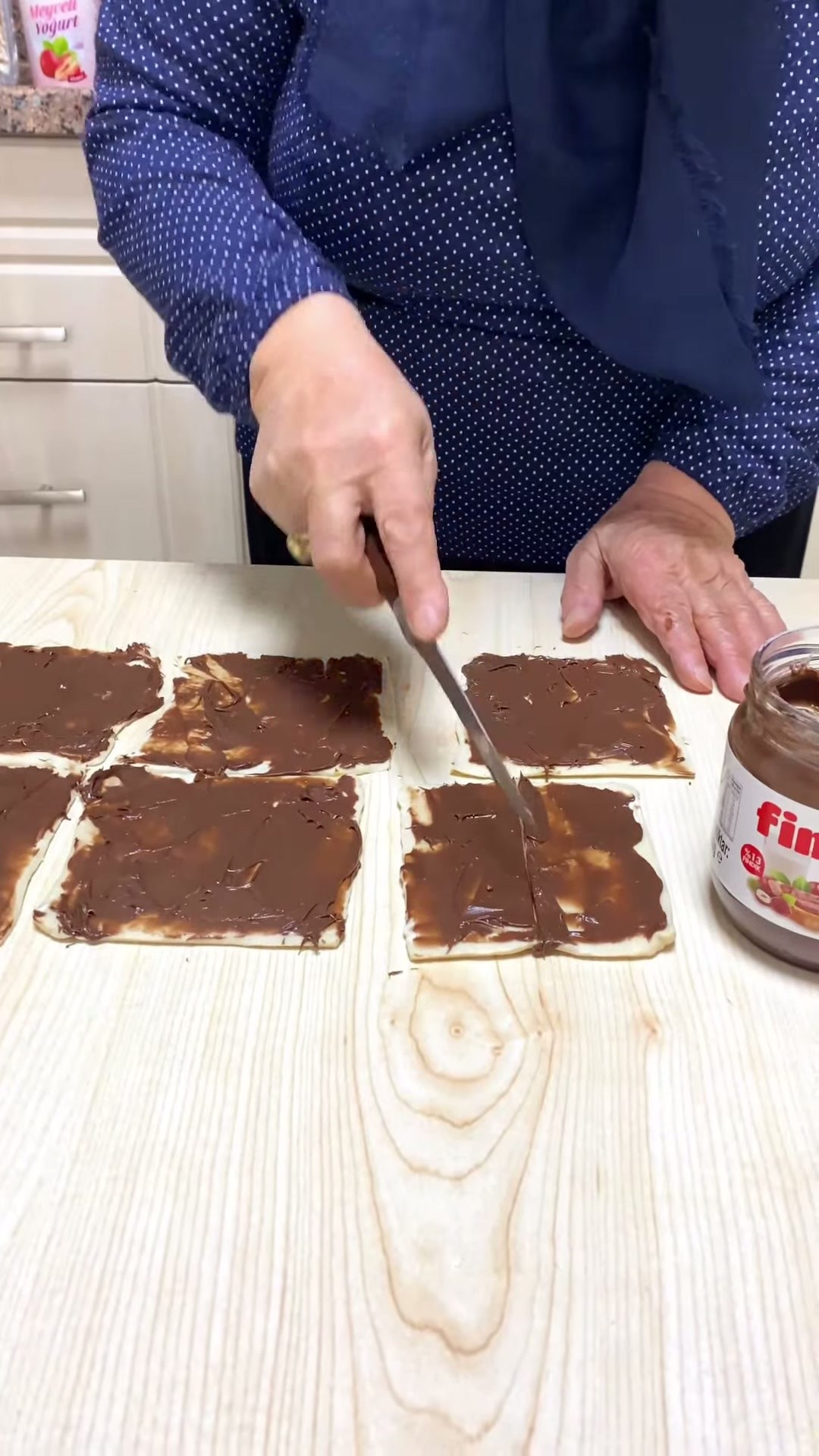 Milföy Waffle tarifi için ilk adım, milföy hamurlarının üzerine kakaolu fındık kremanın sürülmesi ve hamurların çaprazdan ikiye kesilerek üçgen haline getirilmesi olarak belirtiliyor. Ardından bu üçgenler, geniş kenarından rulo yapılarak fırın tepsisine yerleştiriliyor.