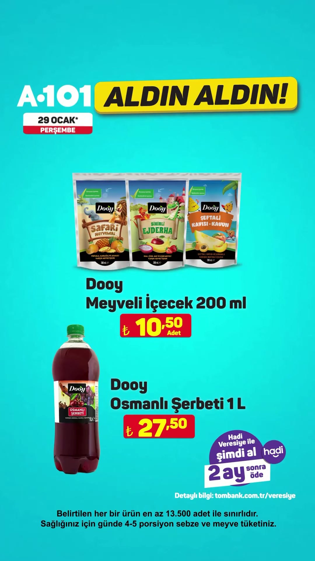 Market zinciri A101, her hafta merakla beklenen 'Aldın Aldın' fırsatlarını yeni bir dönemle daha raflara taşıyor.Yapılan açıklamaya göre, bu haftanın özel indirimli ürünleri 29 Ocak tarihi itibarıyla hem fiziksel mağazalarda hem de online platformlarda geçerli olacak.İndirimler, A101 mağazalarının yanı sıra, dijital alışveriş kanalları olan A101 Kapıda uygulaması ve A101 Ekstra üzerinden de erişilebilir olacak.Yapılan duyuruda, A101 müşterilerinin dikkatine sunulan önemli bir uyarı da yer aldı: Ürün stokları satış noktasına göre farklılık gösterebilir.Müşterilerin, mağaza stoklarında bulunmayan ürünleri, kendilerine en yakın diğer mağazalardan, A101 Ekstra üzerinden veya mobil uygulama olan A101 Kapıda aracılığıyla satın alabilecekleri belirtildi.Editör: Haber MerkeziKaynak: Sosyal Medya