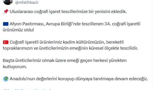 Bakan Mehmet Fatih Kacır, sosyal medya hesabından yaptığı açıklamada, "Uluslararası coğrafi işaret tescillerimize bir yenisini ekledik. Afyon pastırması, Avrupa Birliği'nde tescillenen 34'üncü coğrafi işaretli ürünümüz oldu. Coğrafi işaretli ürünlerimiz kadim kültürümüzün, bereketli topraklarımızın ve üreticilerimizin emeğinin küresel ölçekte tescilidir. Başta üreticilerimiz olmak üzere emeği geçen herkesi yürekten kutluyorum. Anadolu'nun değerlerini koruyup dünyaya tanıtmaya devam edeceğiz" dedi.