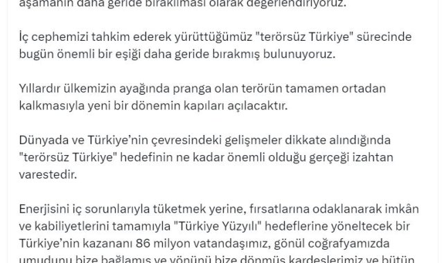 Ala, açıklamasının devamında, "Enerjisini iç sorunlarıyla tüketmek yerine, fırsatlarına odaklanarak imkan ve kabiliyetlerini tamamıyla 'Türkiye Yüzyılı' hedeflerine yöneltecek bir Türkiye'nin kazananı 86 milyon vatandaşımız, gönül coğrafyamızda umudunu bize bağlamış ve yönünü bize dönmüş kardeşlerimiz ve bütün bölgemiz; kaybedeni ise ülkemizi ve bölgemizi istikrarsızlaştırmak isteyenler, terörden, kandan ve şiddetten beslenenler olacaktır. Cumhurbaşkanımız Sayın Recep Tayyip Erdoğan'ın ve Sayın Devlet Bahçeli'nin iradeleri ve dirayetleri ve milletimizin desteği ile ülkemiz, yıllardır her iyinin düşmanı olan bu sorundan kurtulacaktır. Ülkemizin ve bölgemizin istikrarını tahkim edecek bu sürecin sonuca ulaşması için, herkesin katkısının önemli olduğunun altını bir kez daha çiziyoruz" ifadelerine yer verdi.
