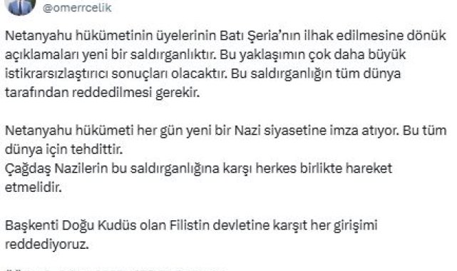 AK Parti Genel Başkan Yardımcısı ve Parti Sözcüsü Ömer Çelik, "Netanyahu hükümetinin üyelerinin, Batı Şeria'nın ilhak edilmesine dönük açıklamaları yeni bir saldırganlıktır. Bu yaklaşımın çok daha büyük istikrarsızlaştırıcı sonuçları olacaktır" dedi.AK Parti Sözcüsü Ömer Çelik, sosyal medya hesabından yaptığı açıklamada, "Netanyahu hükümetinin üyelerinin, Batı Şeria'nın ilhak edilmesine dönük açıklamaları yeni bir saldırganlıktır. Bu yaklaşımın çok daha büyük istikrarsızlaştırıcı sonuçları olacaktır. Bu saldırganlığın tüm dünya tarafından reddedilmesi gerekir. Netanyahu hükümeti her gün yeni bir Nazi siyasetine imza atıyor. Bu tüm dünya için tehdittir. Çağdaş Nazilerin bu saldırganlığına karşı herkes birlikte hareket etmelidir. Başkenti Doğu Kudüs olan Filistin devletine karşıt her girişimi reddediyoruz" ifadelerini kullandı.