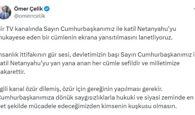 AK Parti'li Çelik, sosyal medya hesabından yaptığı açıklamada, "Bir TV kanalında Sayın Cumhurbaşkanımız ile katil Netanyahu'yu mukayese eden bir cümlenin ekrana yansıtılmasını lanetliyoruz. İnsanlık ittifakının gür sesi, devletimizin başı Sayın Cumhurbaşkanımız ile katil Netanyahu'yu yan yana anan her cümle sefildir ve milletimize hakarettir. İlgili kanal özür dilemiş, özür için gereğinin yapılması gerekir. Cumhurbaşkanımıza dönük saygısızlıklarla hukuki ve siyasi zeminde en net şekilde mücadele edeceğimizden kimsenin kuşkusu olmasın" ifadelerine yer verdi.